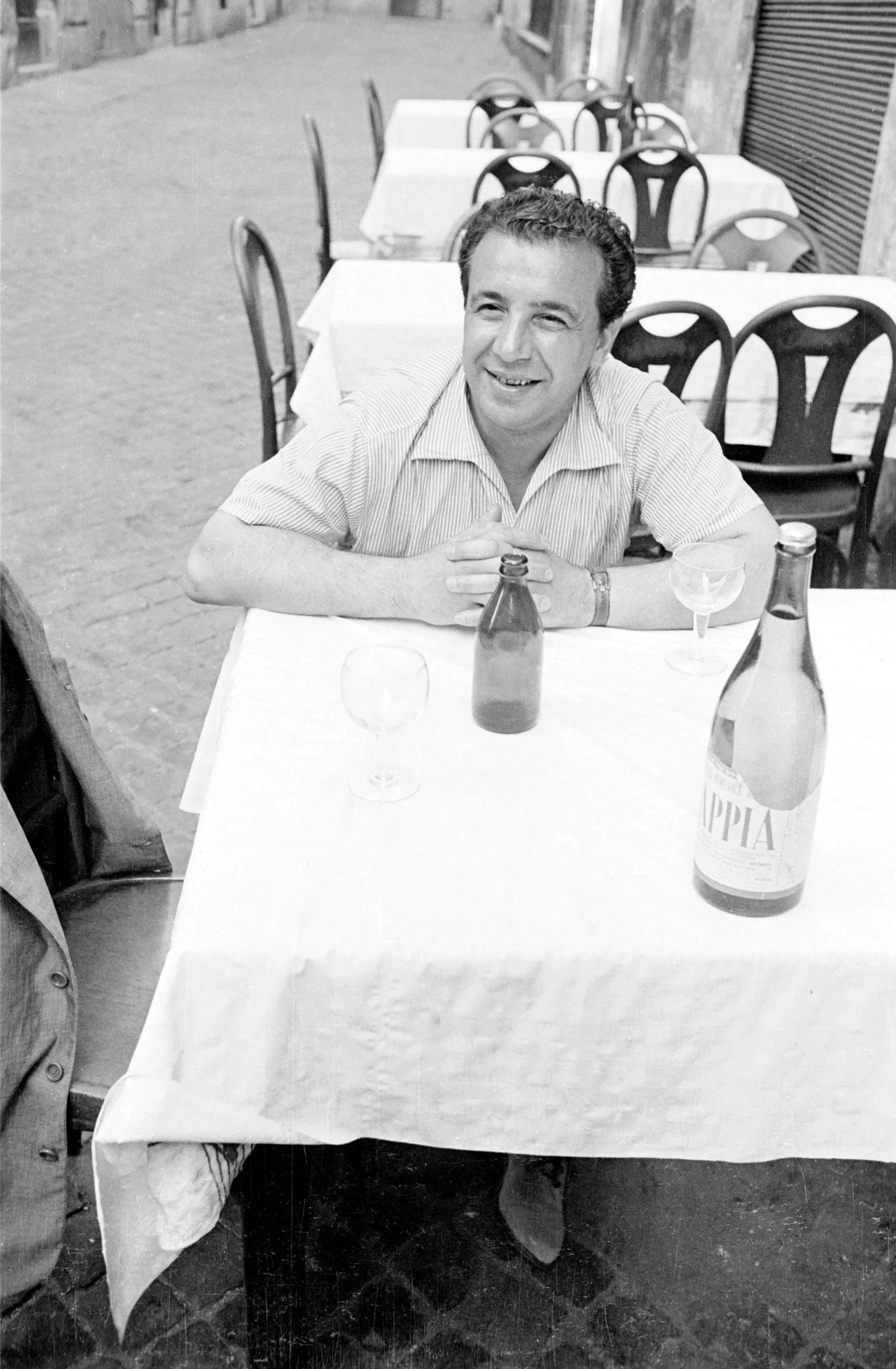Black and white photograph of a smiling man leaning over an outdoor café table with wine glasses and a labeled bottle, shot from slightly above