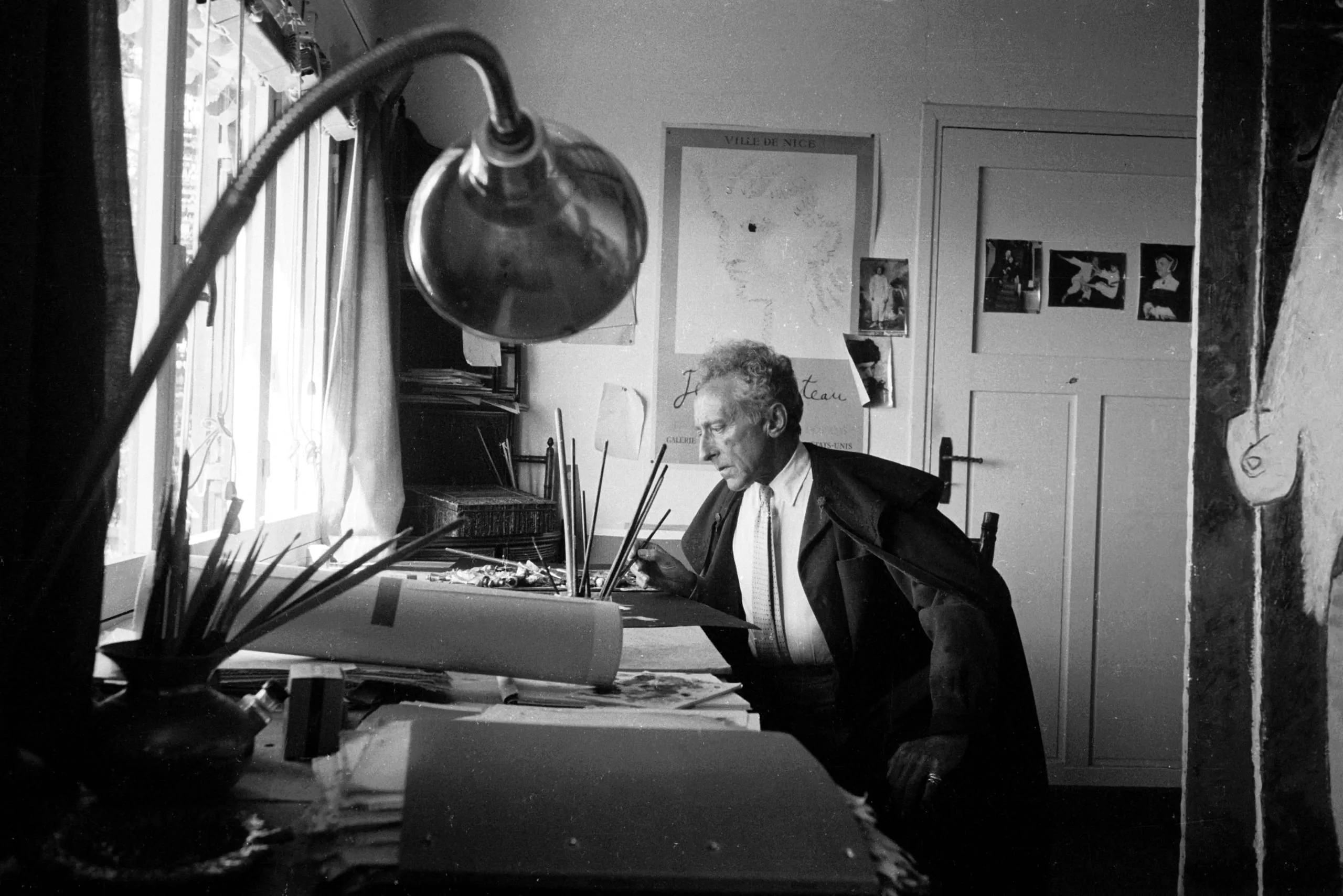 Black and white photograph of an older white man with white curly hair seated at a cluttered desk, leaning over papers under a gooseneck lamp, framed by a doorway