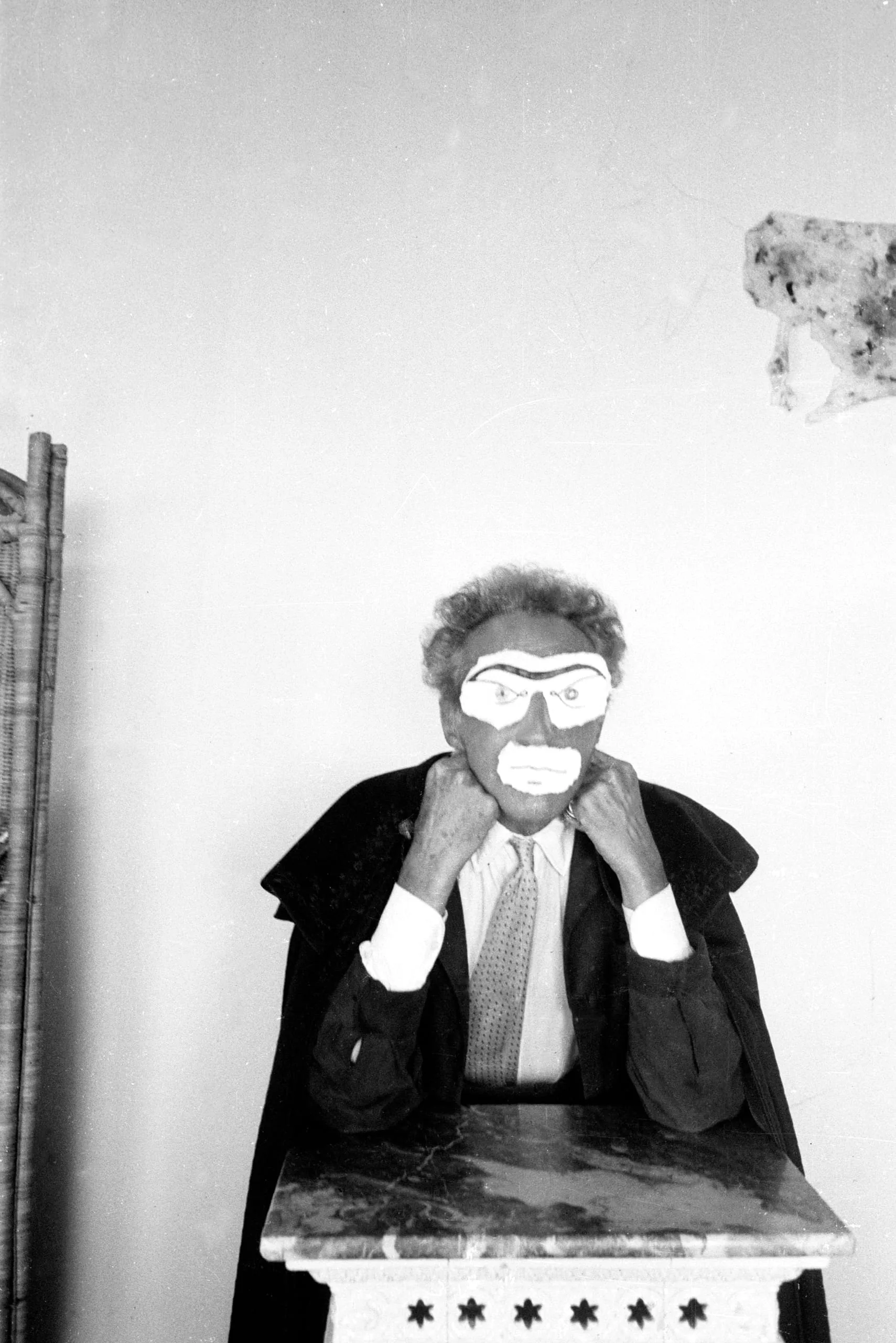 Black and white photograph of a man in a dark cape holding a hand-drawn mask to his face, seated behind a marble-topped pedestal