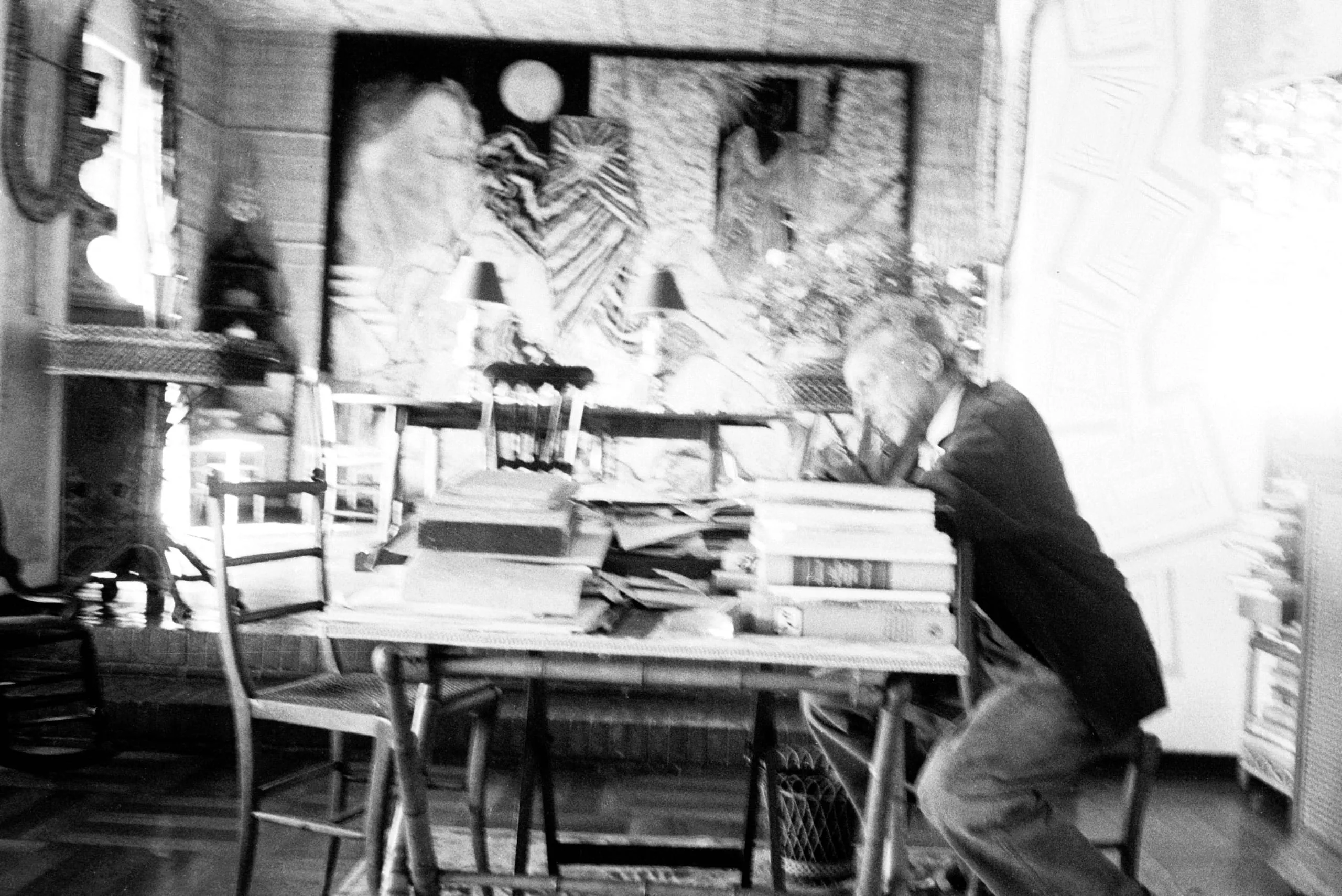 Blurry black and white photograph of a man in a dark jacket leaning over a table stacked with books in a room hung with a large figurative painting