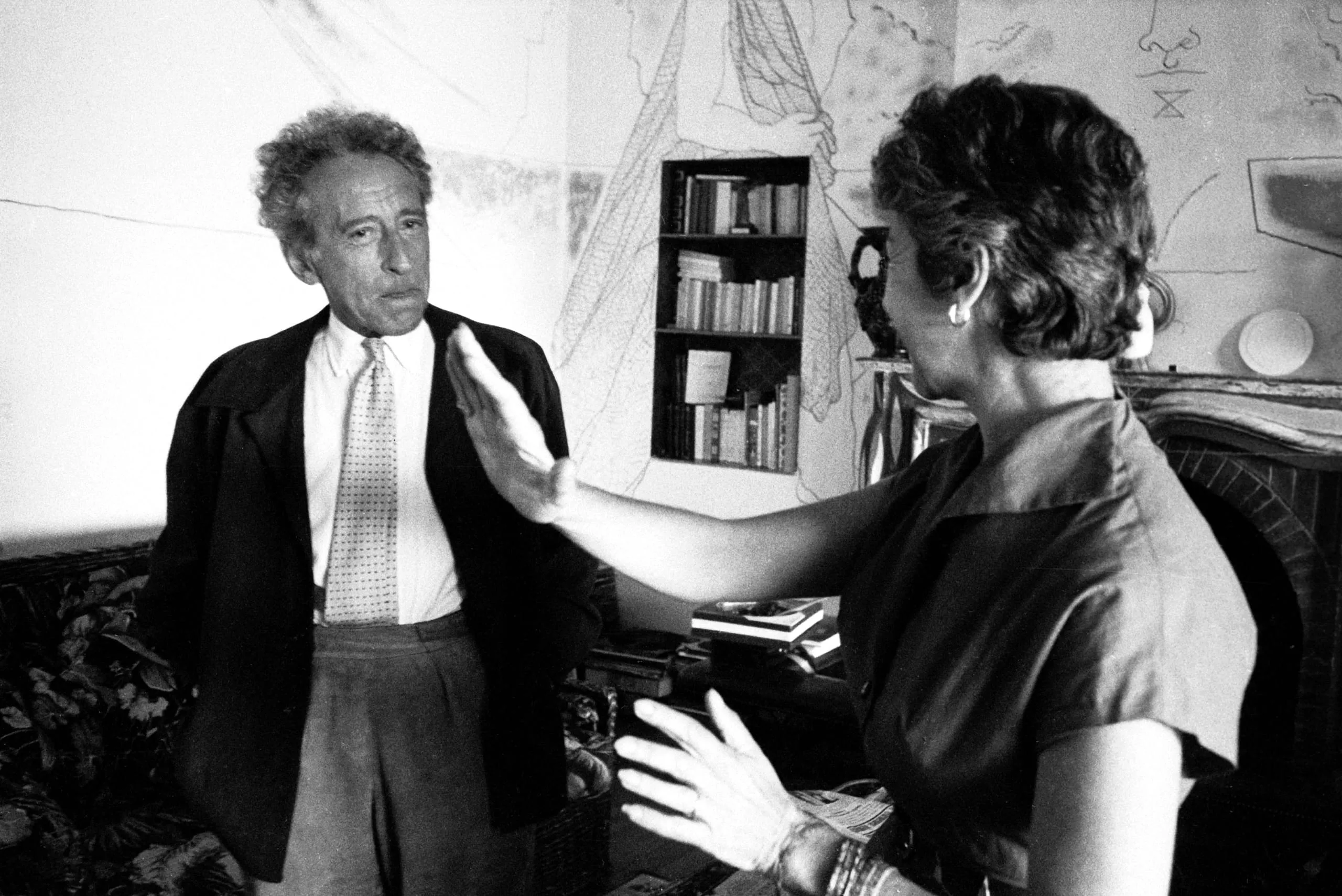 Black and white photograph of a man and woman facing each other in a room with a large wall mural, mid-conversation with gesturing hands