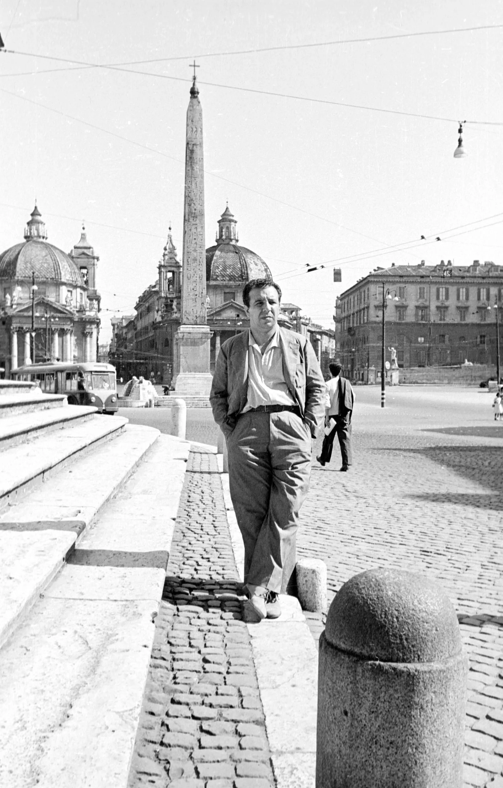Black and white photograph of a man leaning against a stone barrier in a Roman piazza, with an obelisk and baroque church domes in the distance