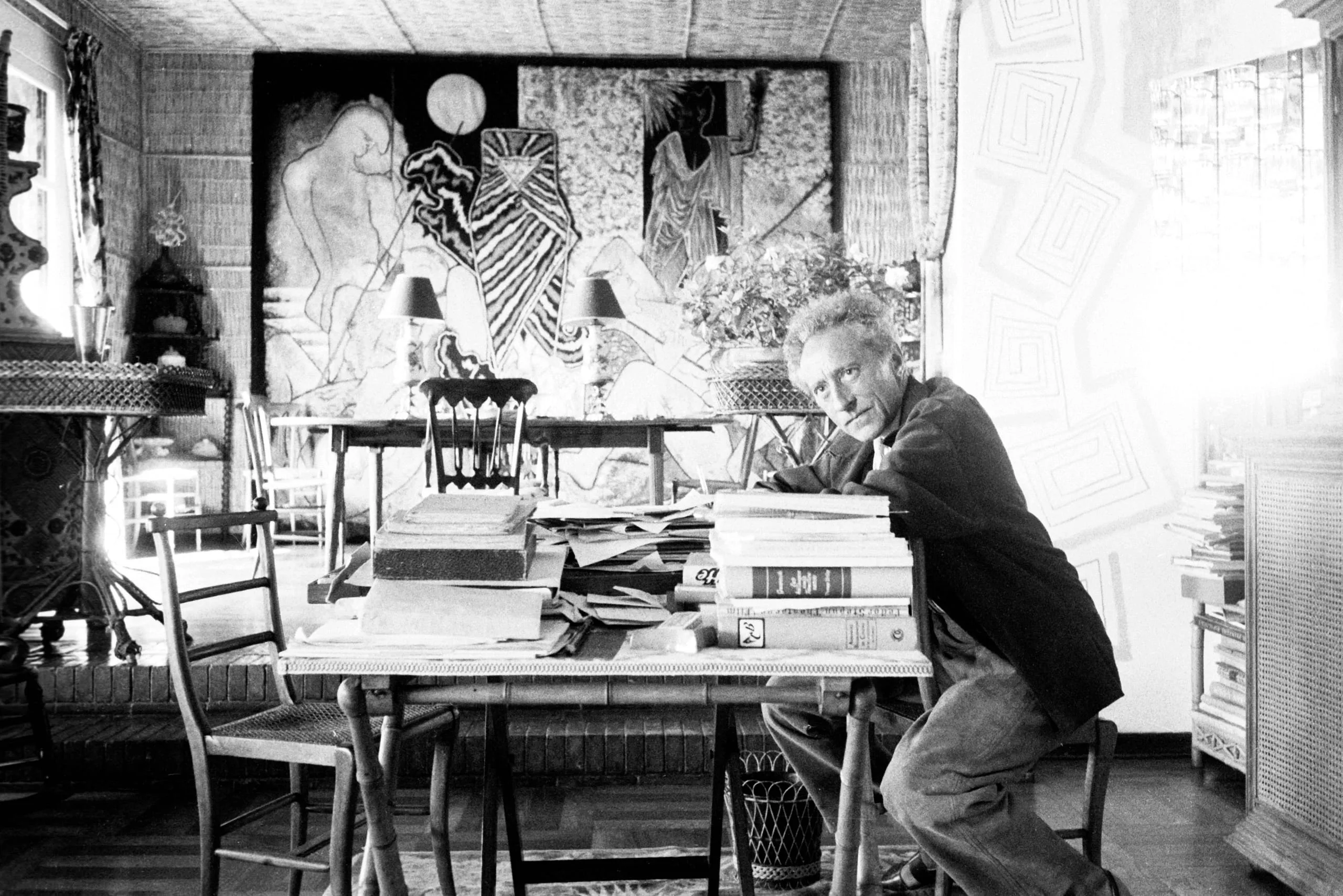 Black and white photograph of an older man leaning on a stack of books at a cluttered table, a large figurative painting or tapestry visible on the wall behind him