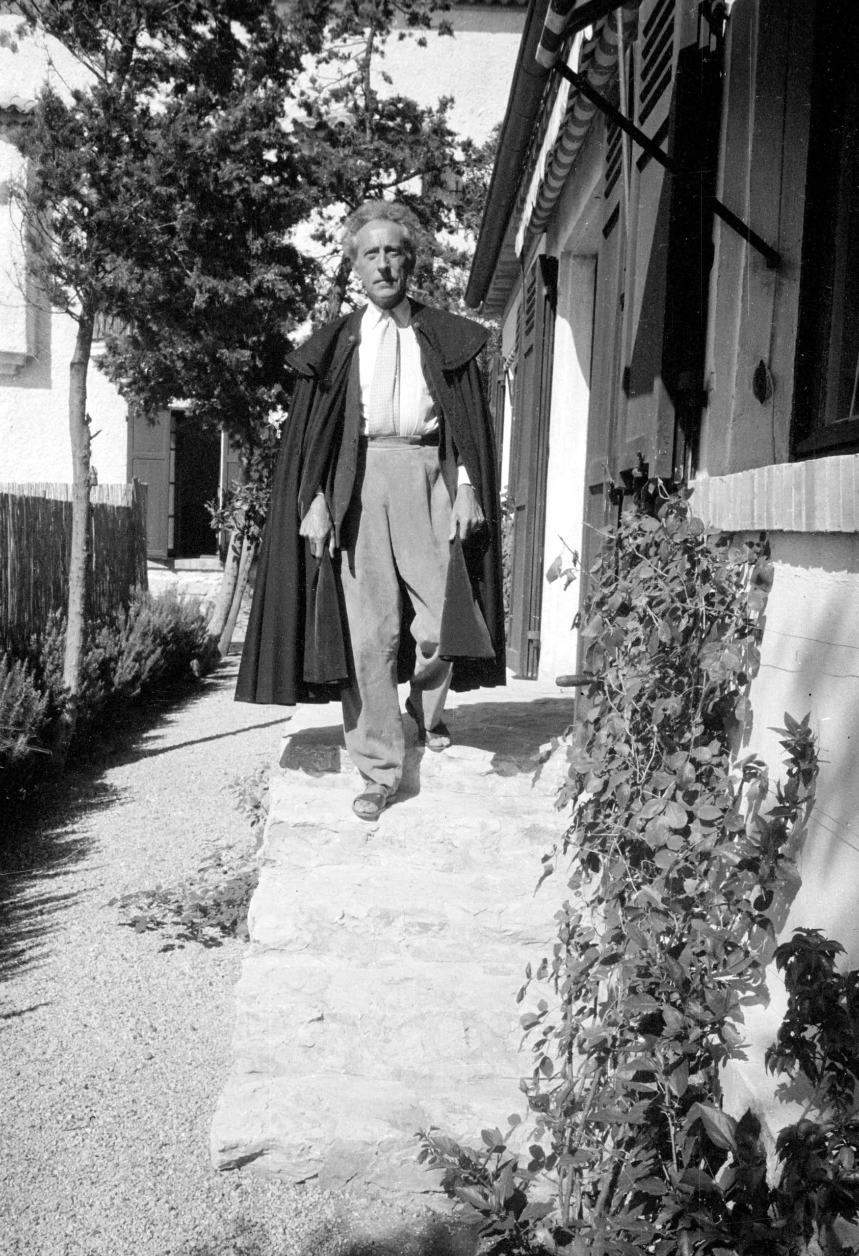 Black and white photograph of an older man in a dark cape striding toward the camera along a stone path beside a white stucco building