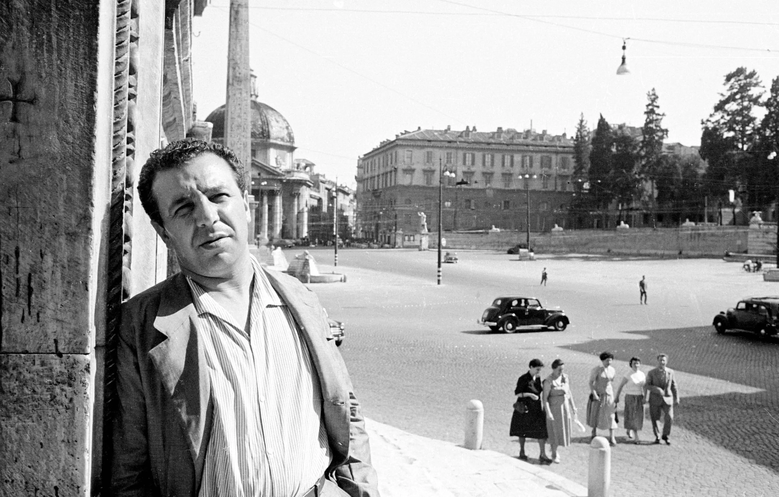 Black and white photograph, man with dark curly hair leaning against a stone wall, sunlit Italian city square with domed church and obelisk in the distance