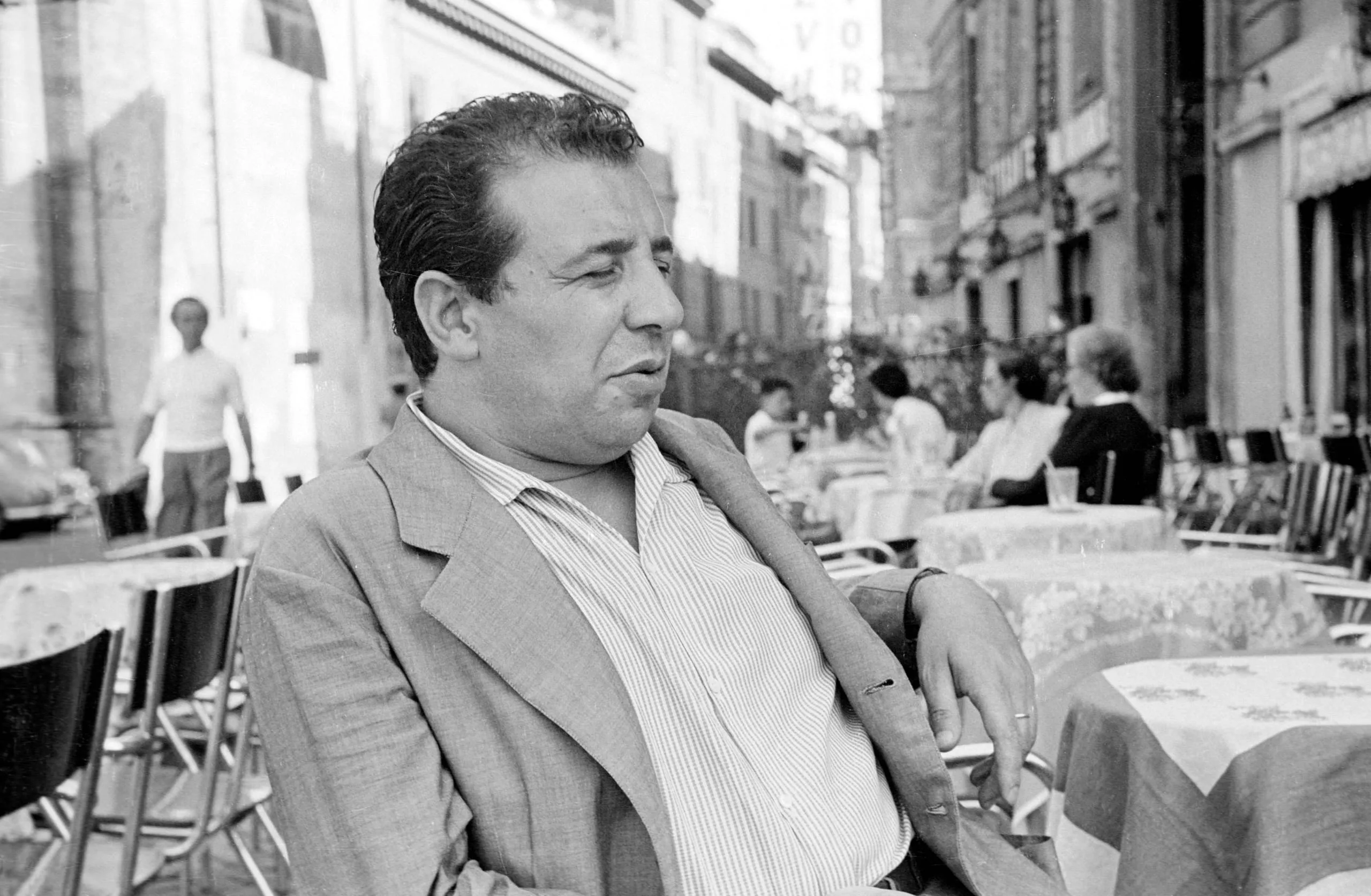 Black and white photograph, man in a sport coat seated at an outdoor café table, holding a cigarette, city street visible in the background