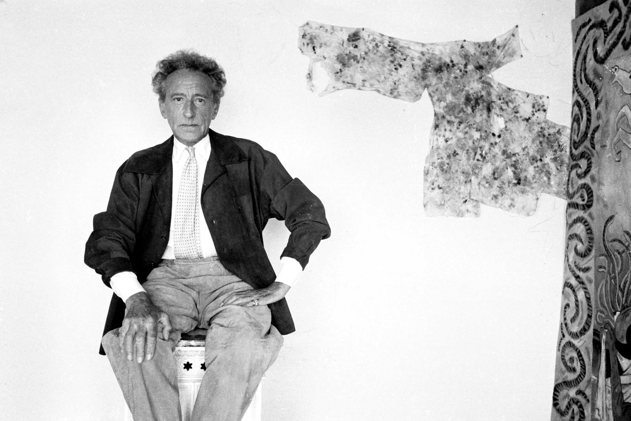Black and white photograph of a lean man in a dark blazer and loose tie seated on a small white stool, looking directly at the camera, with a mottled garment hanging on the wall behind him