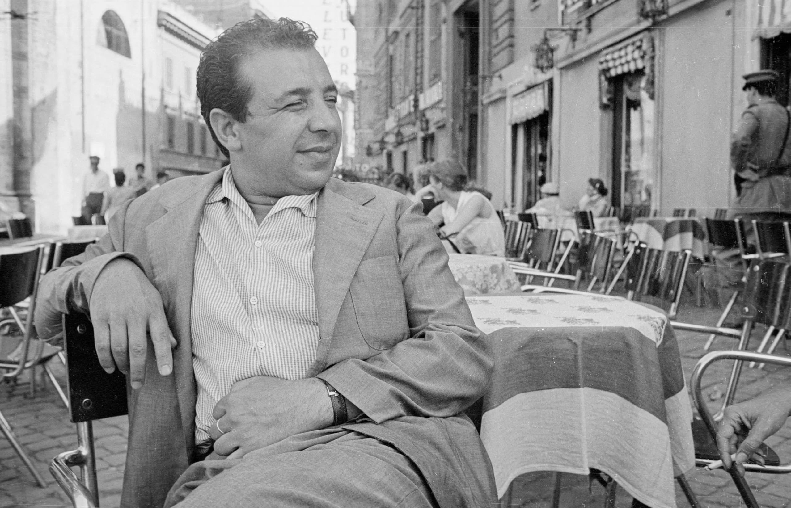 Black and white photograph of a middle-aged man in a linen suit seated at an outdoor café table, looking to his left, with an urban street scene behind him