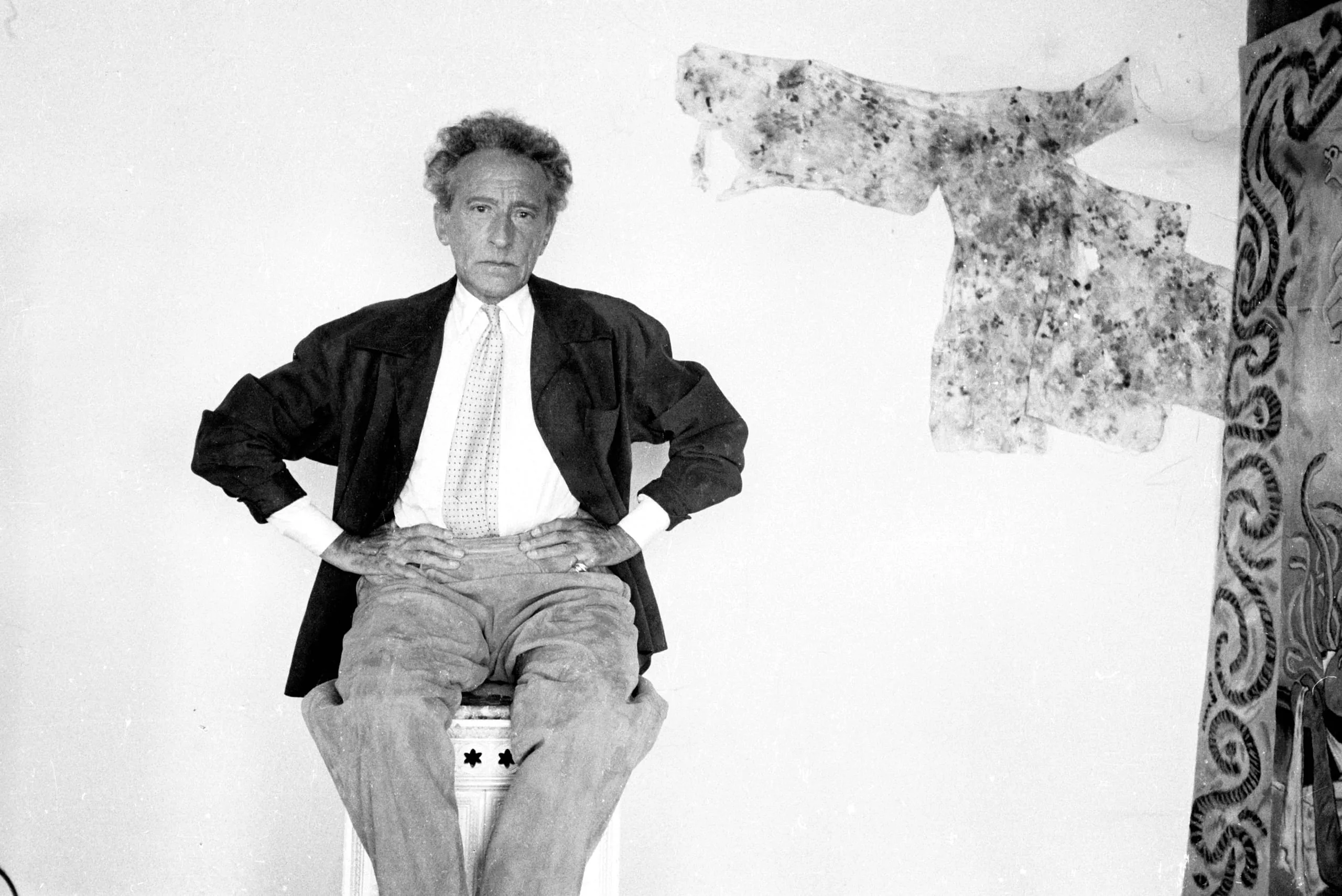 Black and white photograph of a man seated on a low stool, hands on hips, wearing a dark blazer and tie, with a large decorative artwork partially visible to the right
