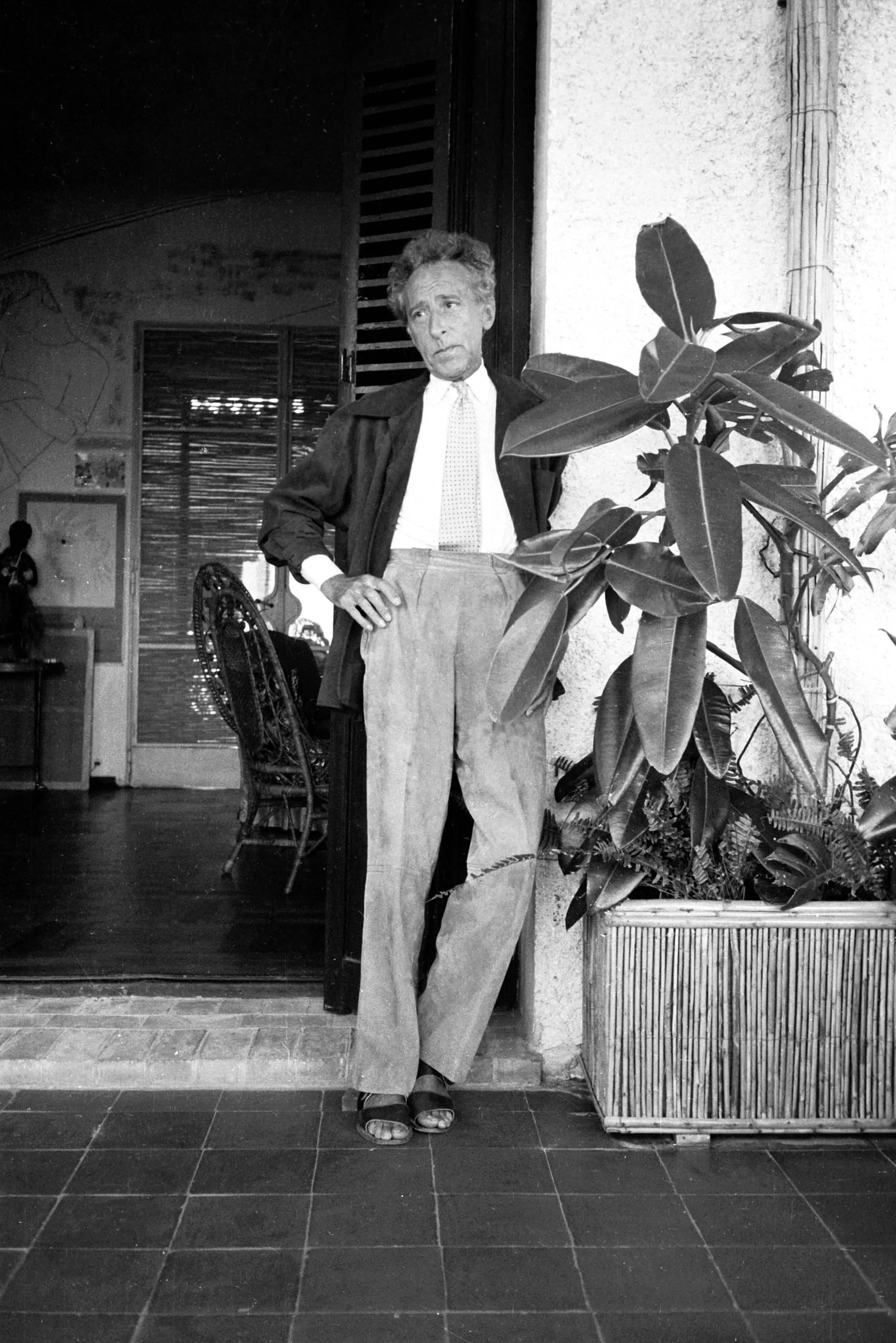 Black and white full-length photograph of a man in loose trousers, dress shirt, and open jacket standing on a tiled porch beside a large leafy plant in a rattan planter