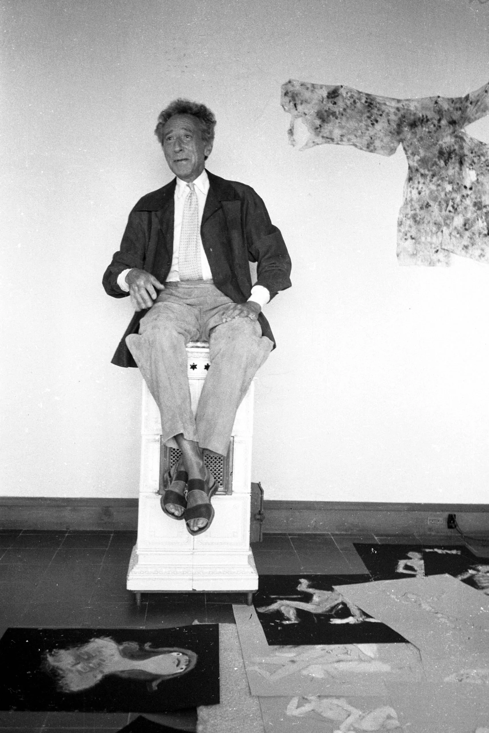 Black and white photograph of an older man with disheveled white hair seated on a white pedestal in an artist's studio, surrounded by paintings on the floor