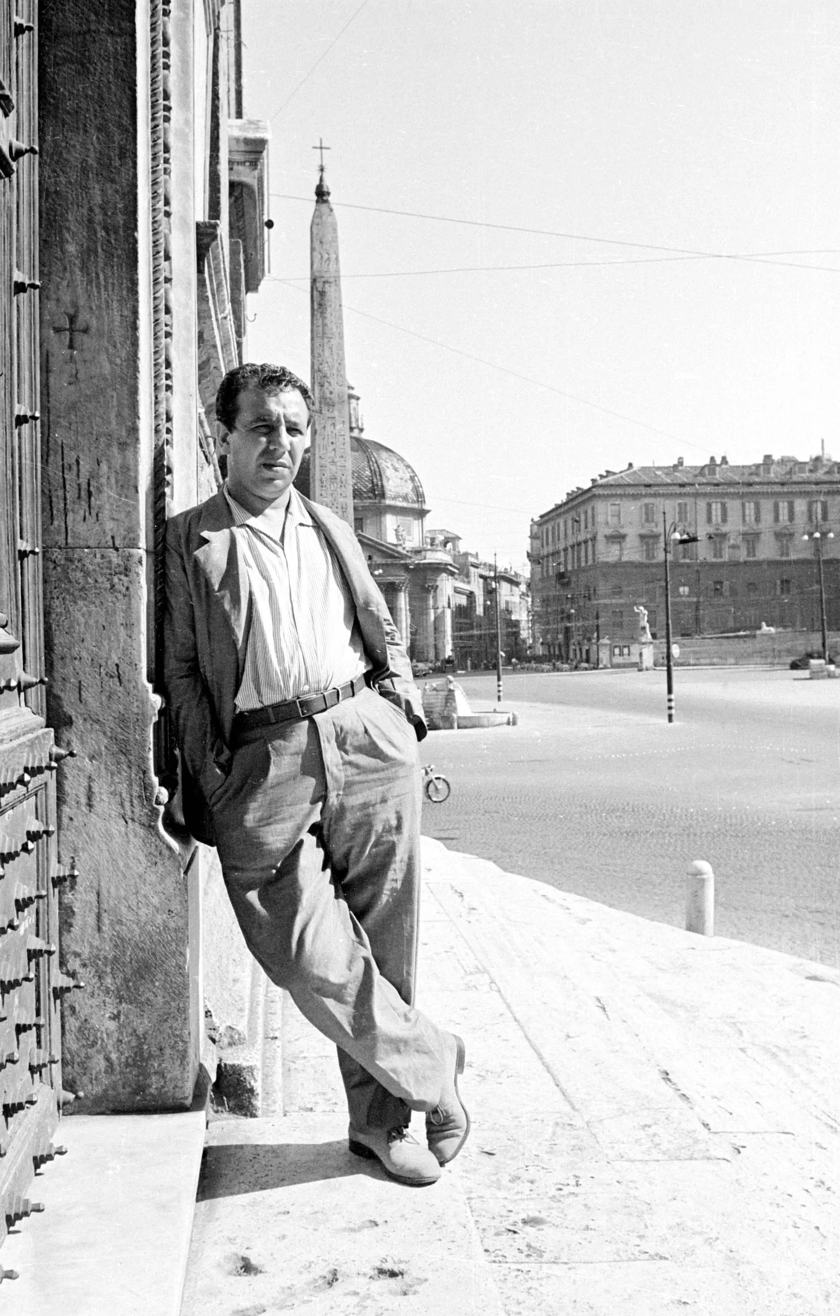 Black and white photograph, full-length portrait of a man leaning against a stone building on a sunny city sidewalk, with an obelisk and domed church visible in the open piazza behind him