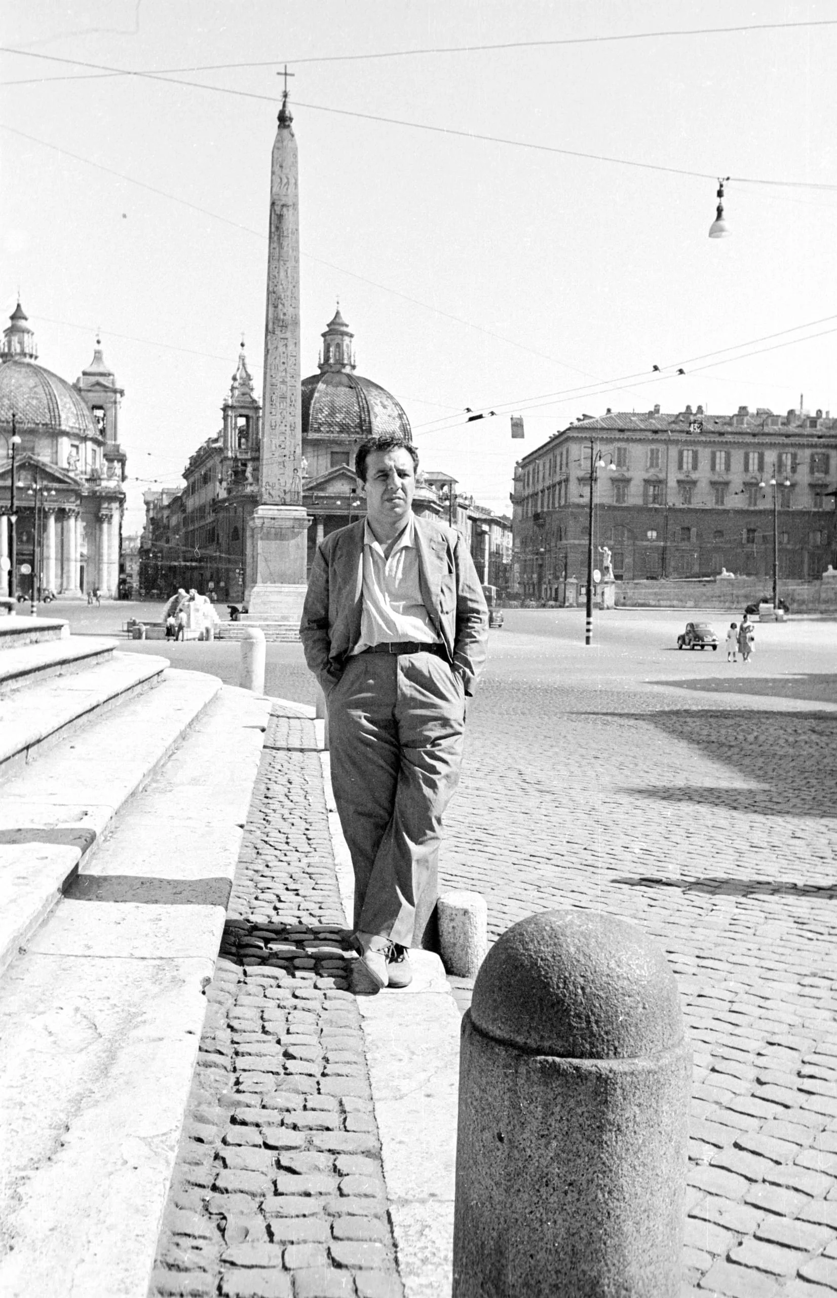 Black and white photograph of a man in casual shirt and trousers leaning against a stone curb in a large cobblestone piazza, with a baroque church and obelisk in the distance