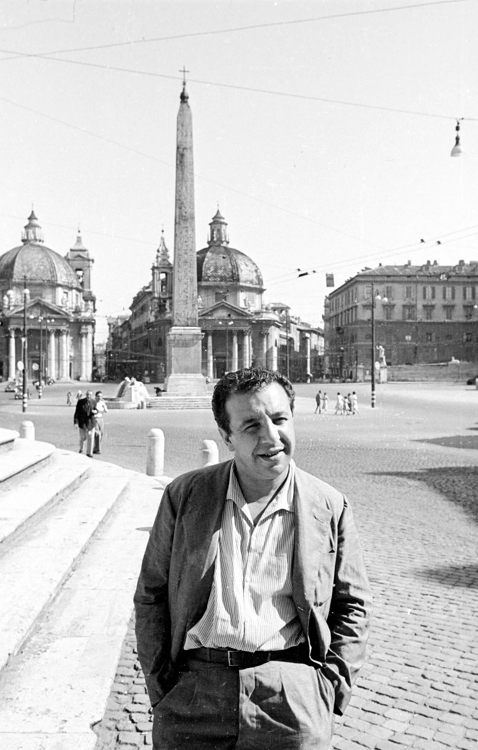 Black and white photograph of a man in a blazer and open-collar shirt standing in a sun-lit cobblestone plaza, with an Egyptian obelisk and twin Baroque domed churches in the distance