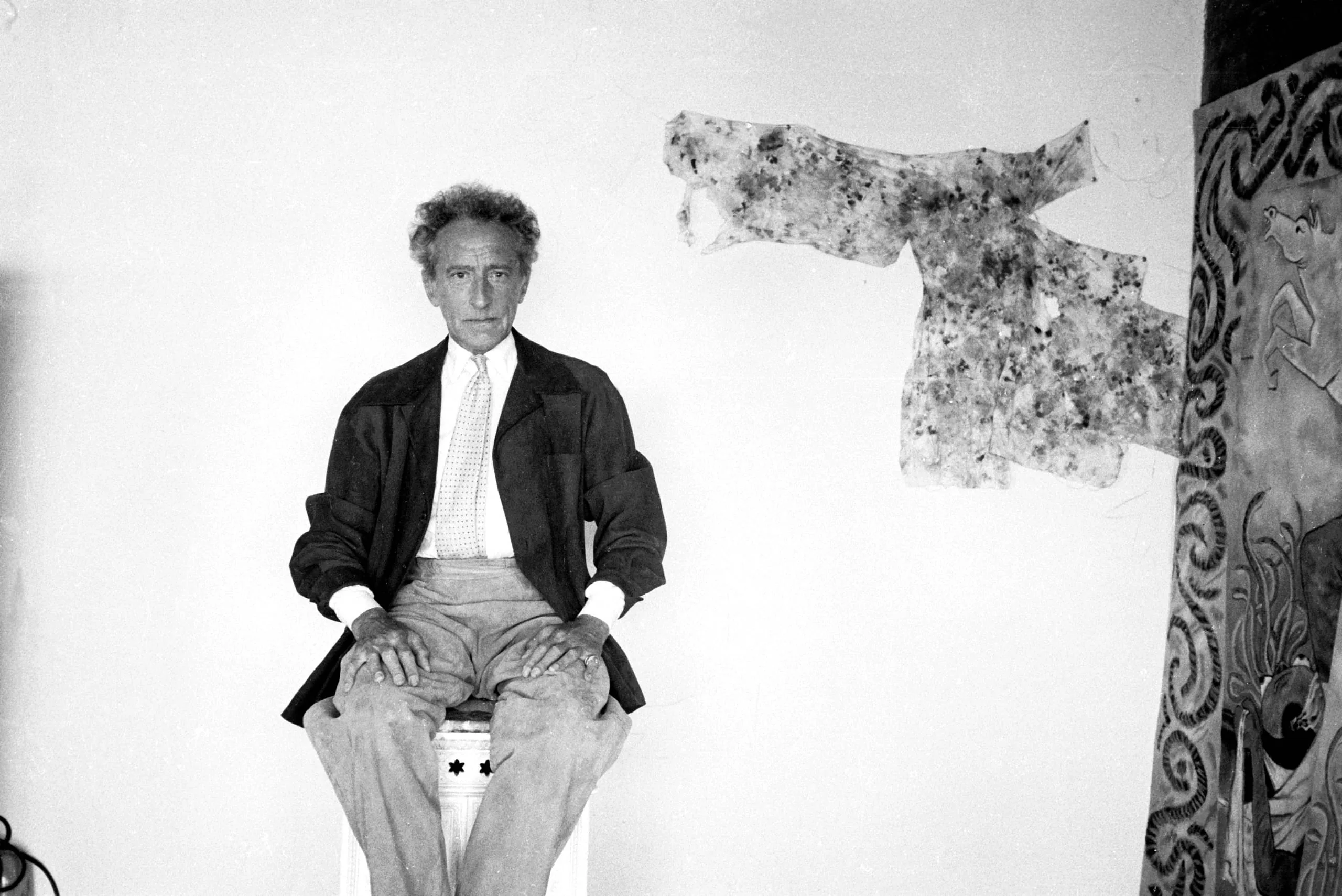 Black and white photograph of an older white man in a dark jacket seated on a small stool, hands on knees, facing the camera, with painted artworks visible on the wall behind him