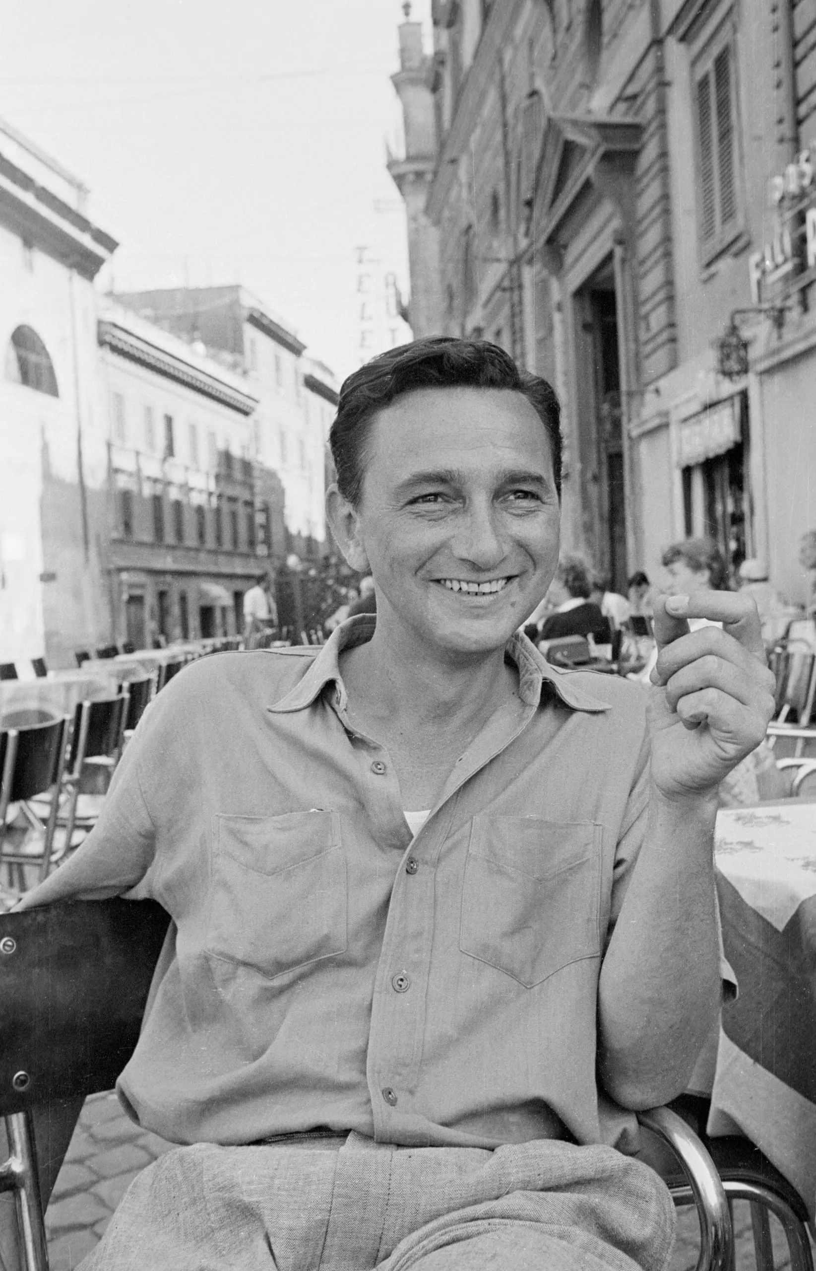 Black and white photograph of a smiling man seated at an outdoor café, holding a small cigar, with a European street receding behind him