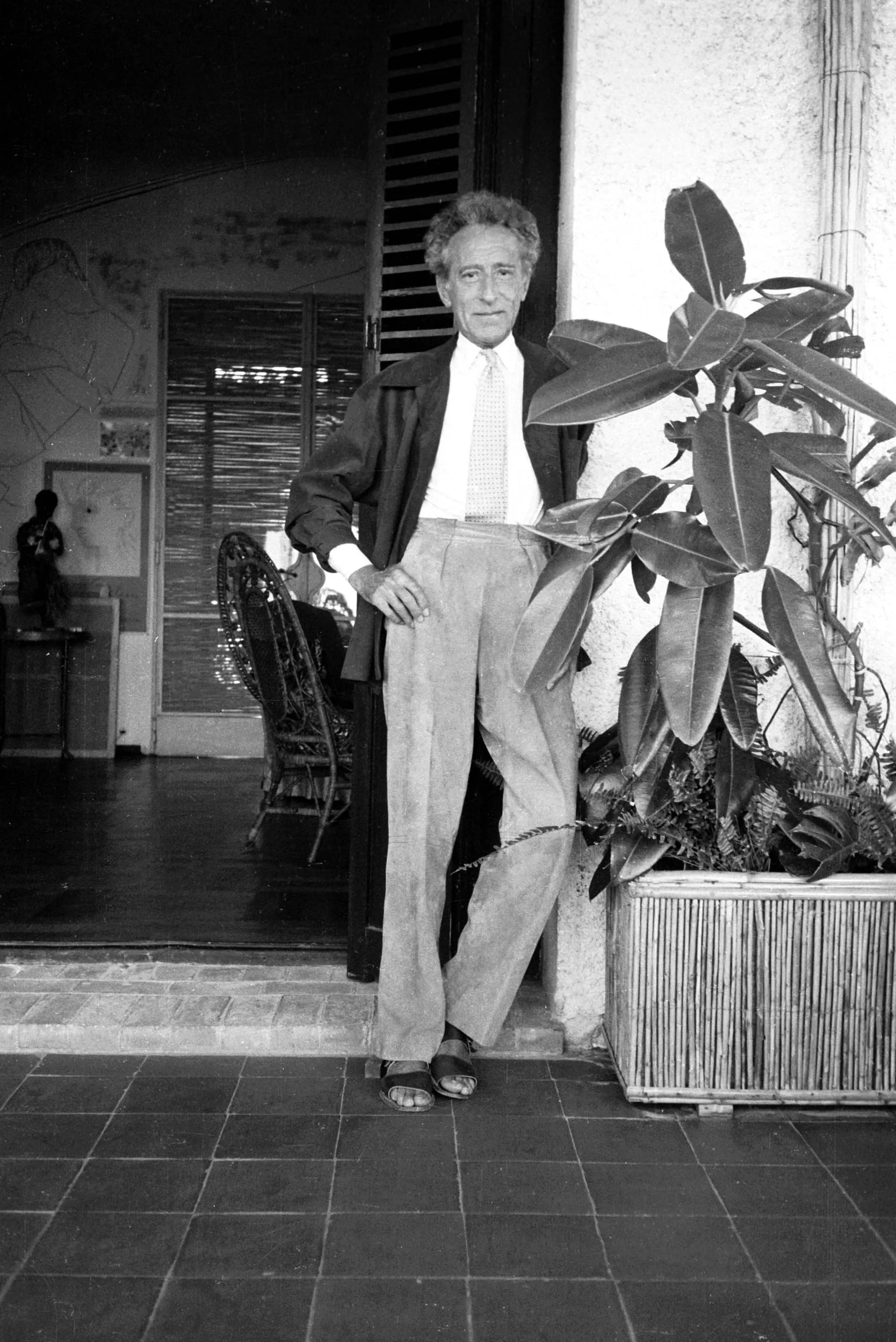 Black and white full-length photograph of a lean older man in a blazer, dress shirt, tie, and wide-leg trousers, standing on a tiled porch beside a large potted plant