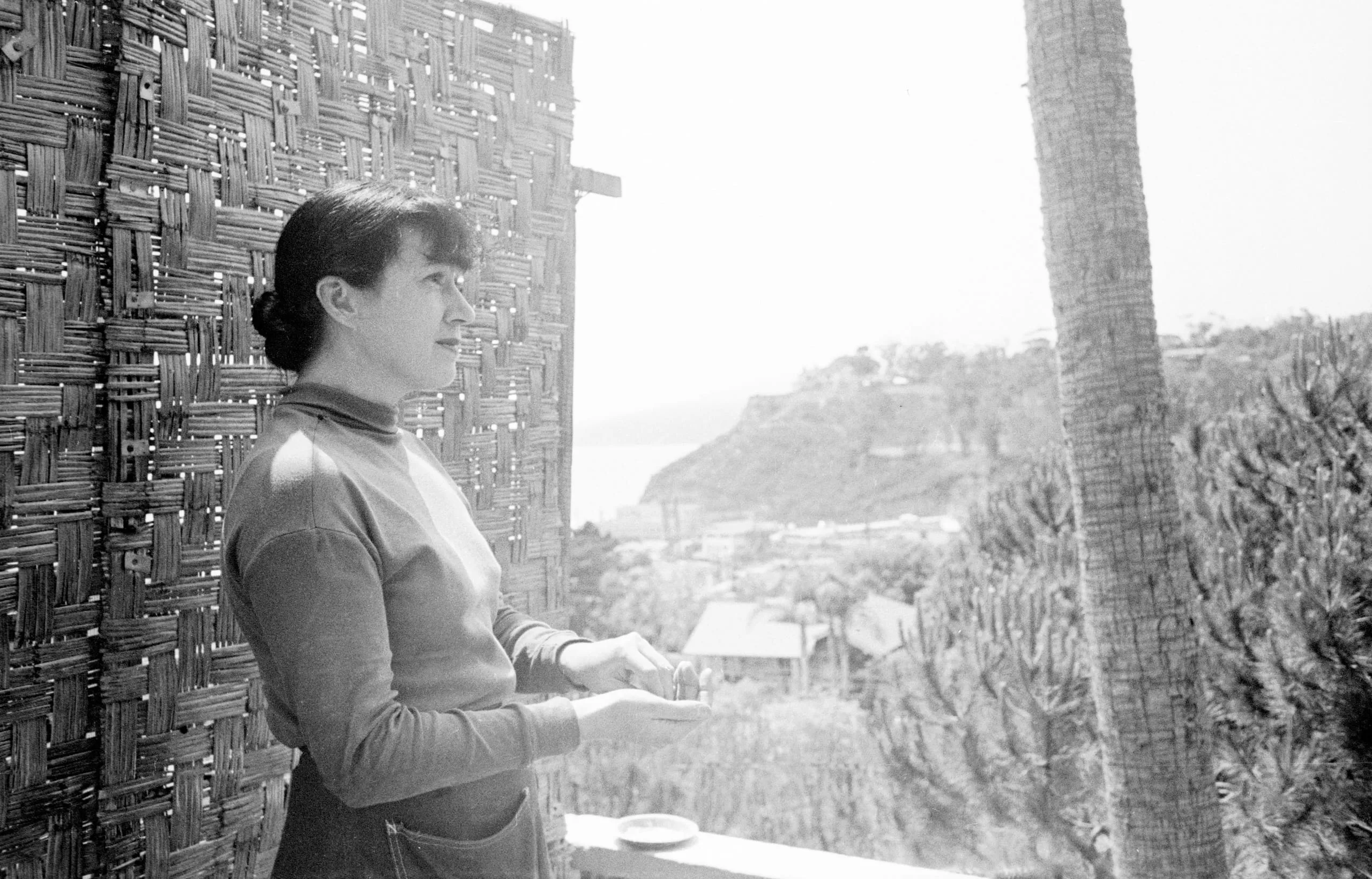 Black and white photograph of a woman in a turtleneck standing on a terrace beside a woven bamboo panel, a palm trunk and coastal hillside visible behind her