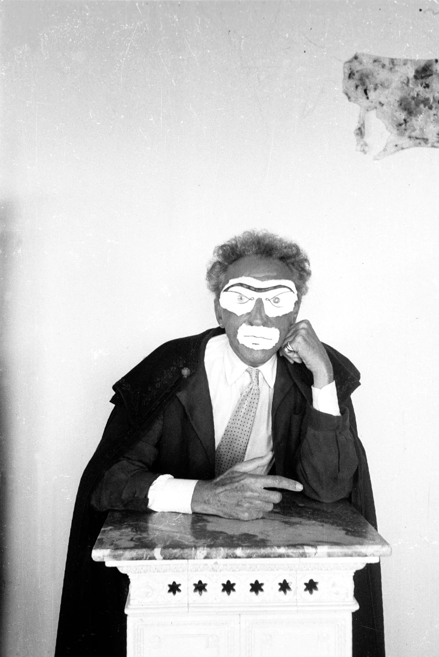 Black and white photograph of a man in a dark cape and dotted tie, seated behind a marble-topped pedestal, wearing a flat painted mask over his face
