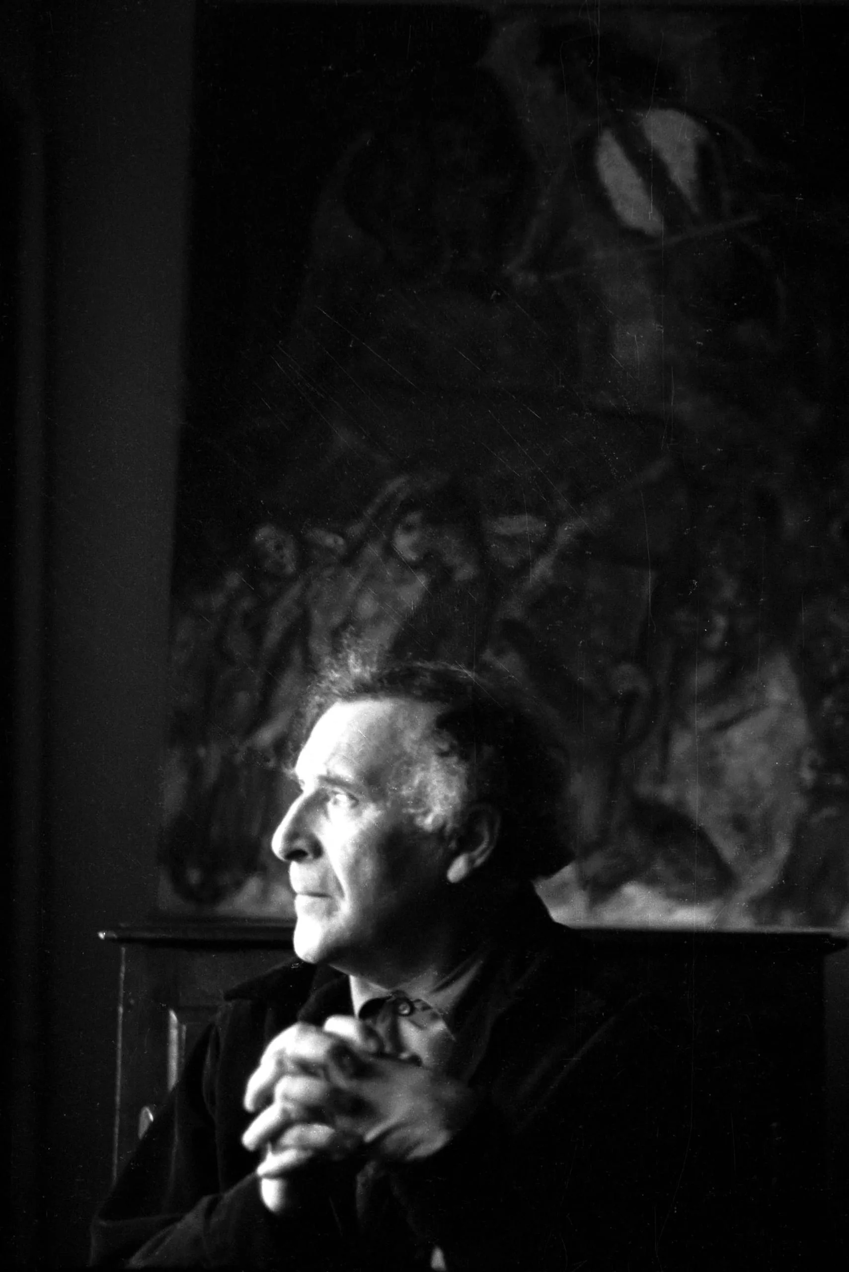Black and white portrait photograph of a white man in profile, lit dramatically from the left, hands clasped, seated before a large dark abstract painting