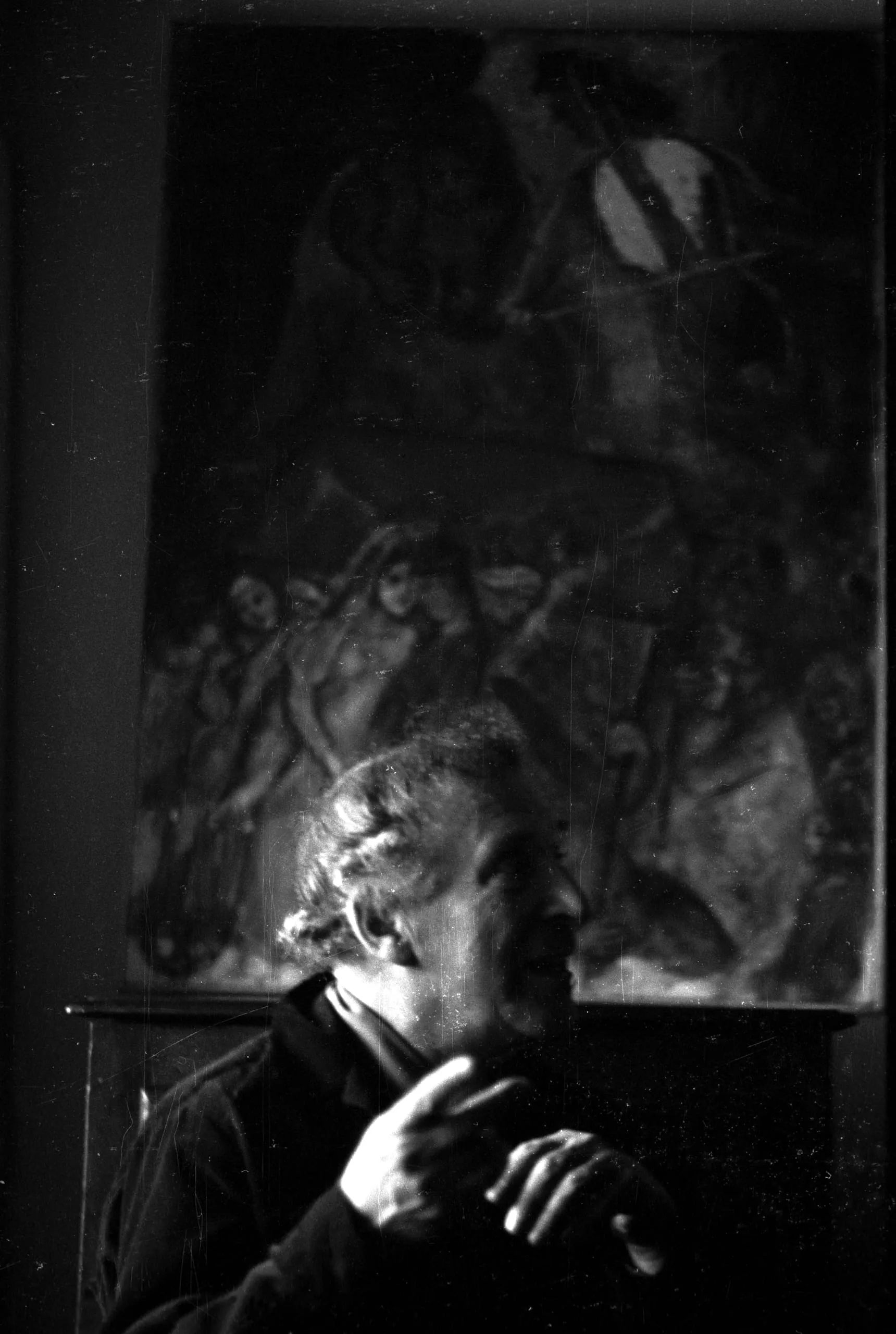 Black and white photograph, a person in profile with chin raised and hands gesturing near the chest, dramatically lit from the left, a large dark figurative painting visible on the wall behind them