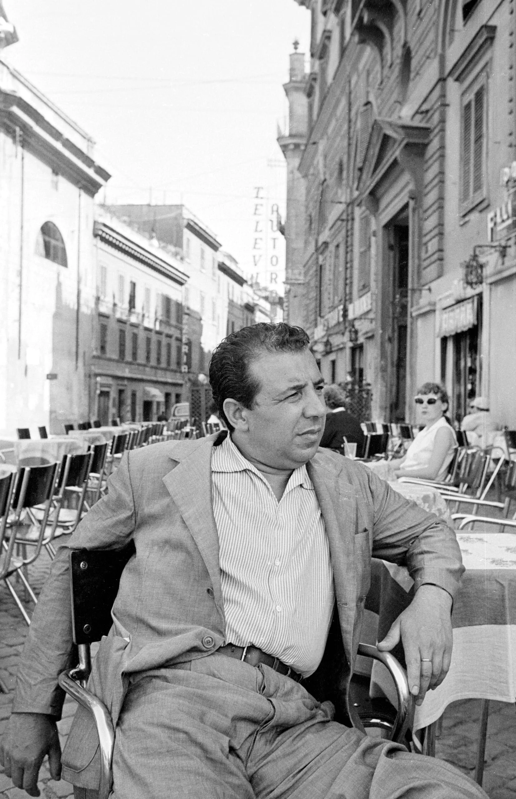 Black and white photograph of a heavyset man in a suit jacket and open-collar striped shirt seated at an outdoor café, looking to the left, with a European street receding into the background