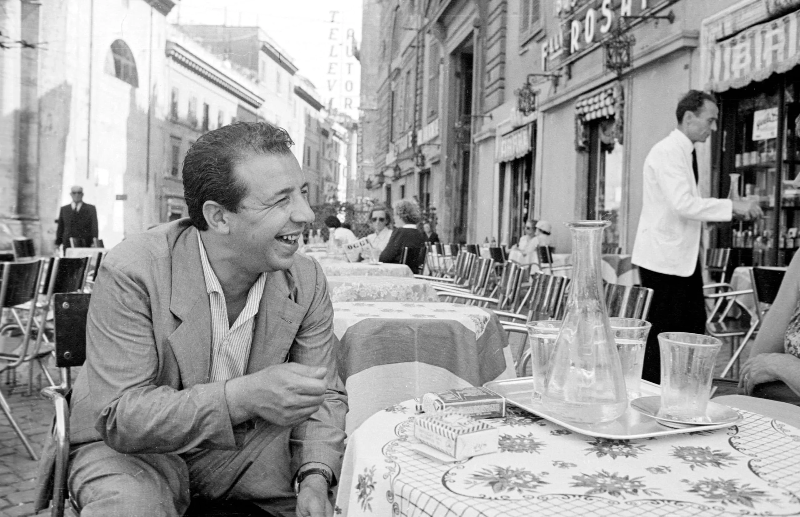 Black and white photograph of a man in a blazer laughing at an outdoor café table on a busy European street