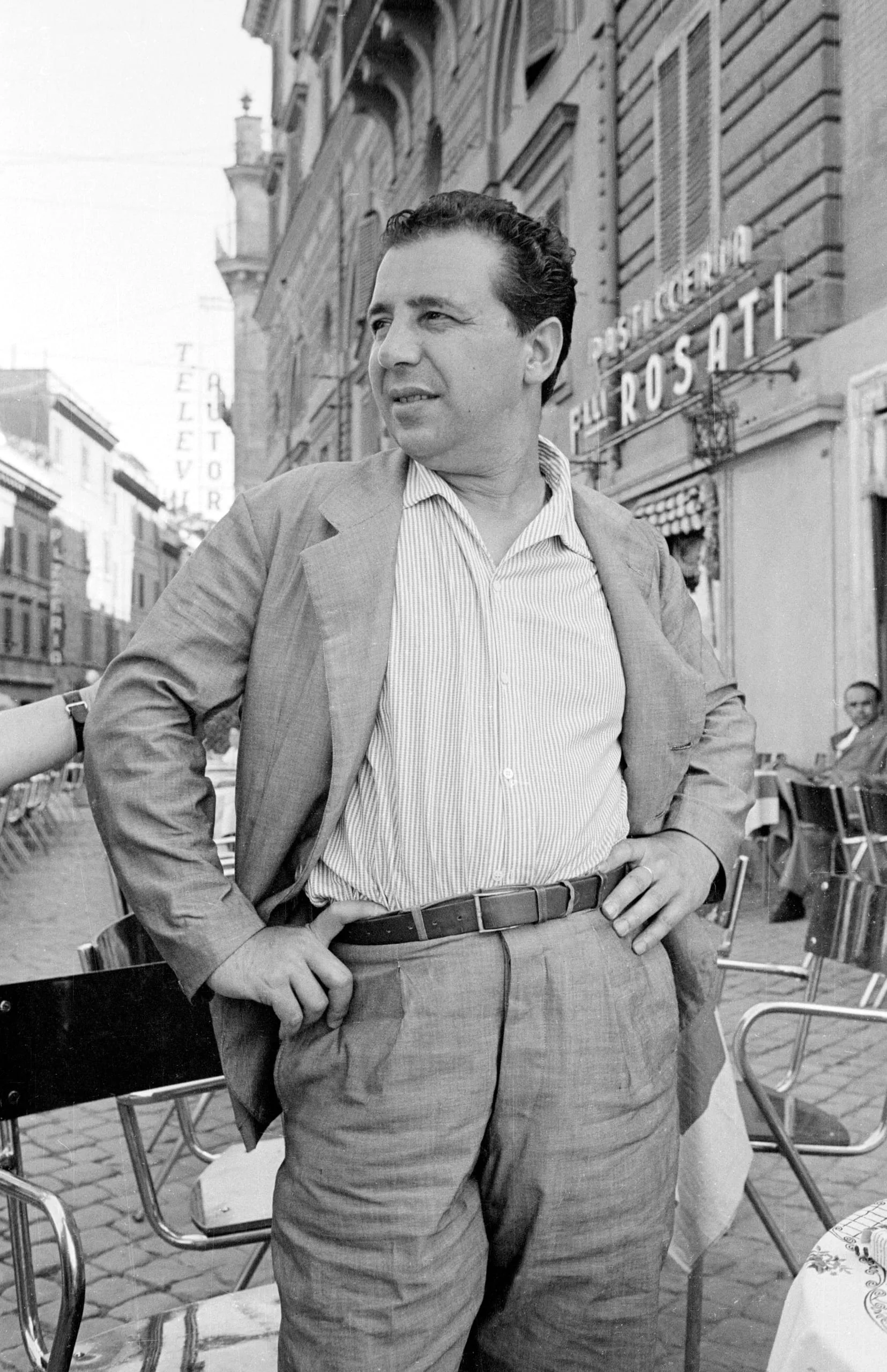 Black and white photograph of a heavyset man in a sport coat and striped shirt, hands on waistband, standing outside an Italian café
