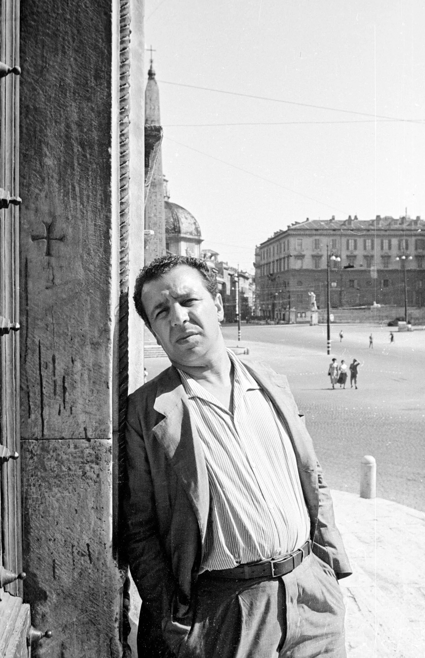 Black and white photograph, man leaning against a stone wall from the hips up, striped shirt and blazer, sunlit Italian piazza visible behind him