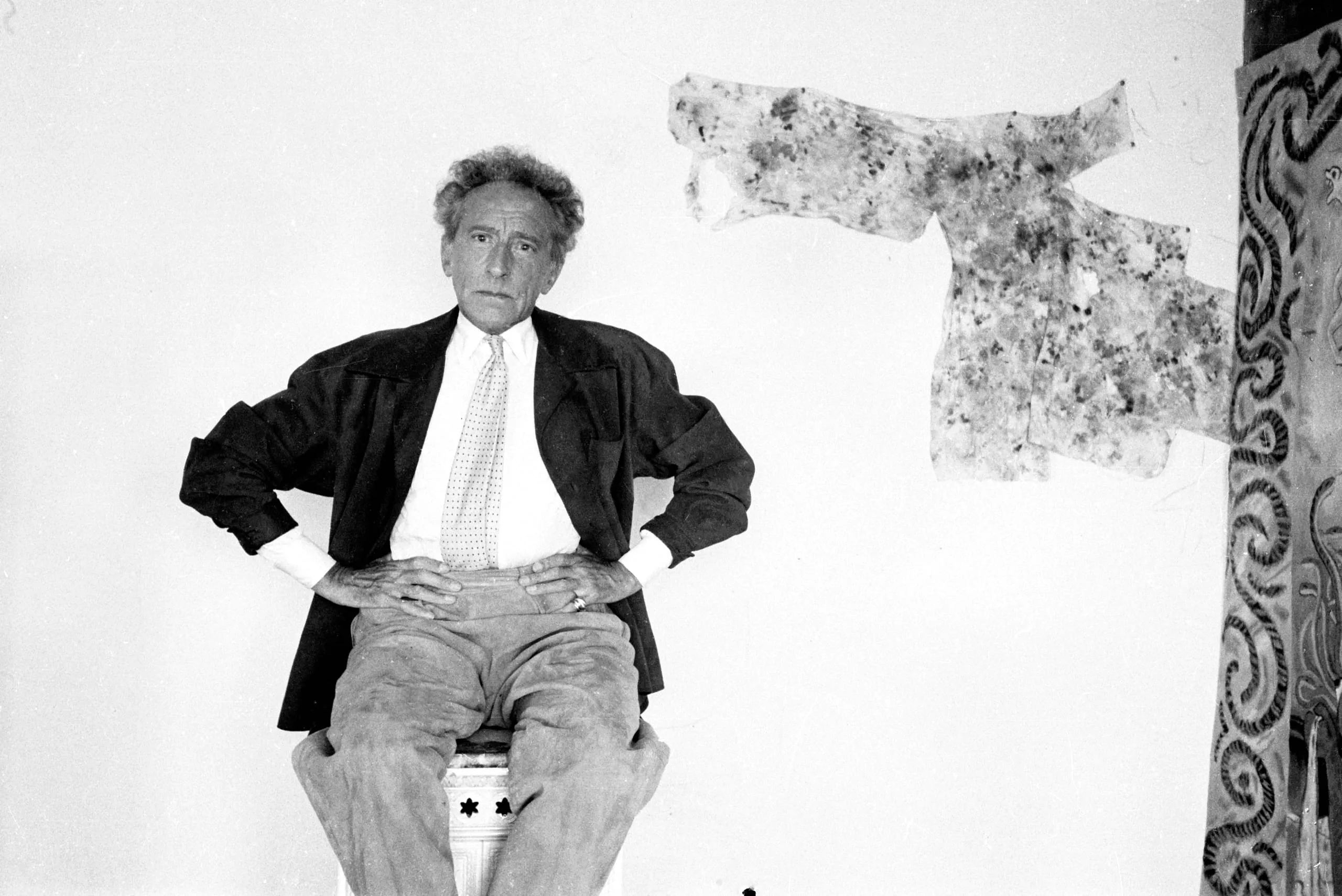 Black and white photograph of a man seated with hands on hips, wearing a blazer and tie, against a white wall hung with a mottled, cross-shaped form