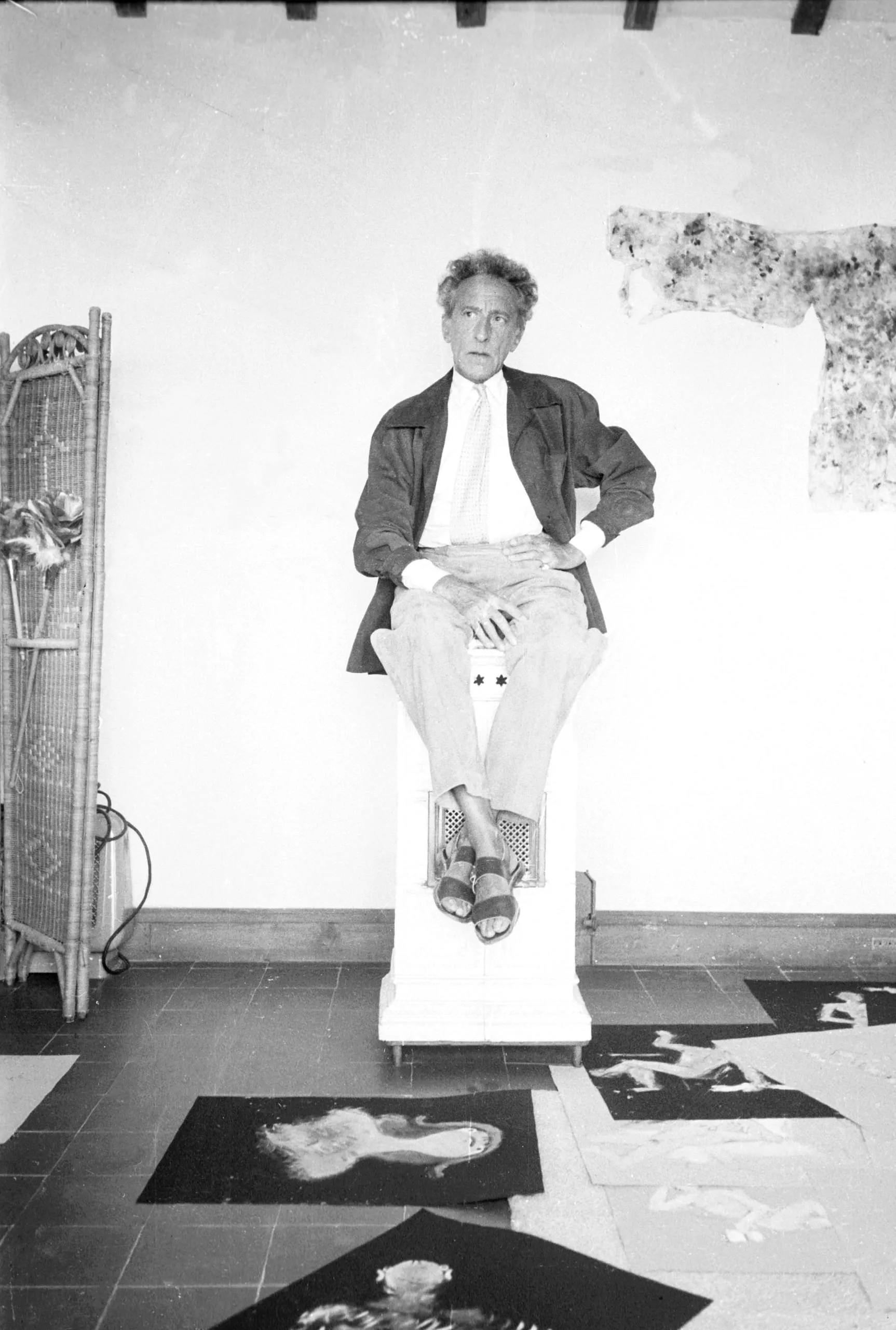 Black and white photograph of an elderly man seated on a tall white block in an artist's studio, surrounded by prints on the floor and artwork on the wall