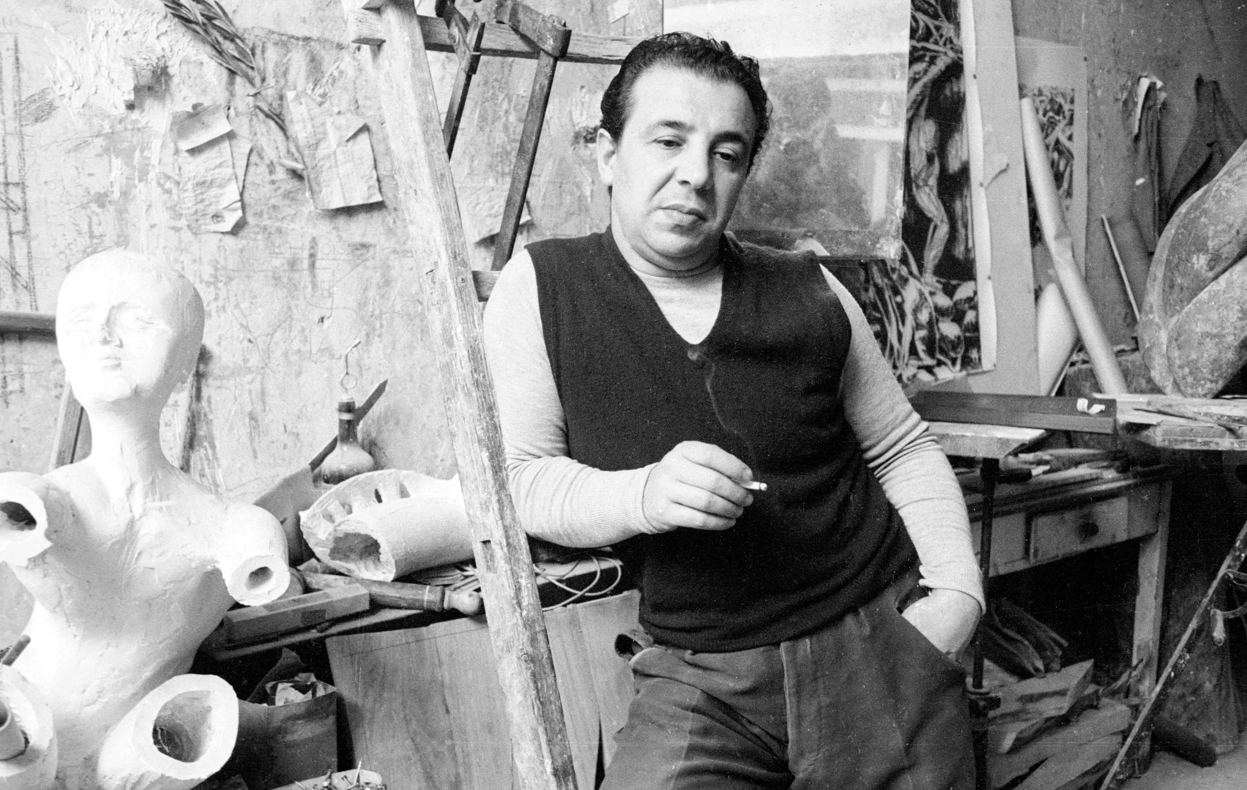 Black and white photograph of a man in a sleeveless vest holding a cigarette, standing among plaster sculptures and tools in a sculptor's studio