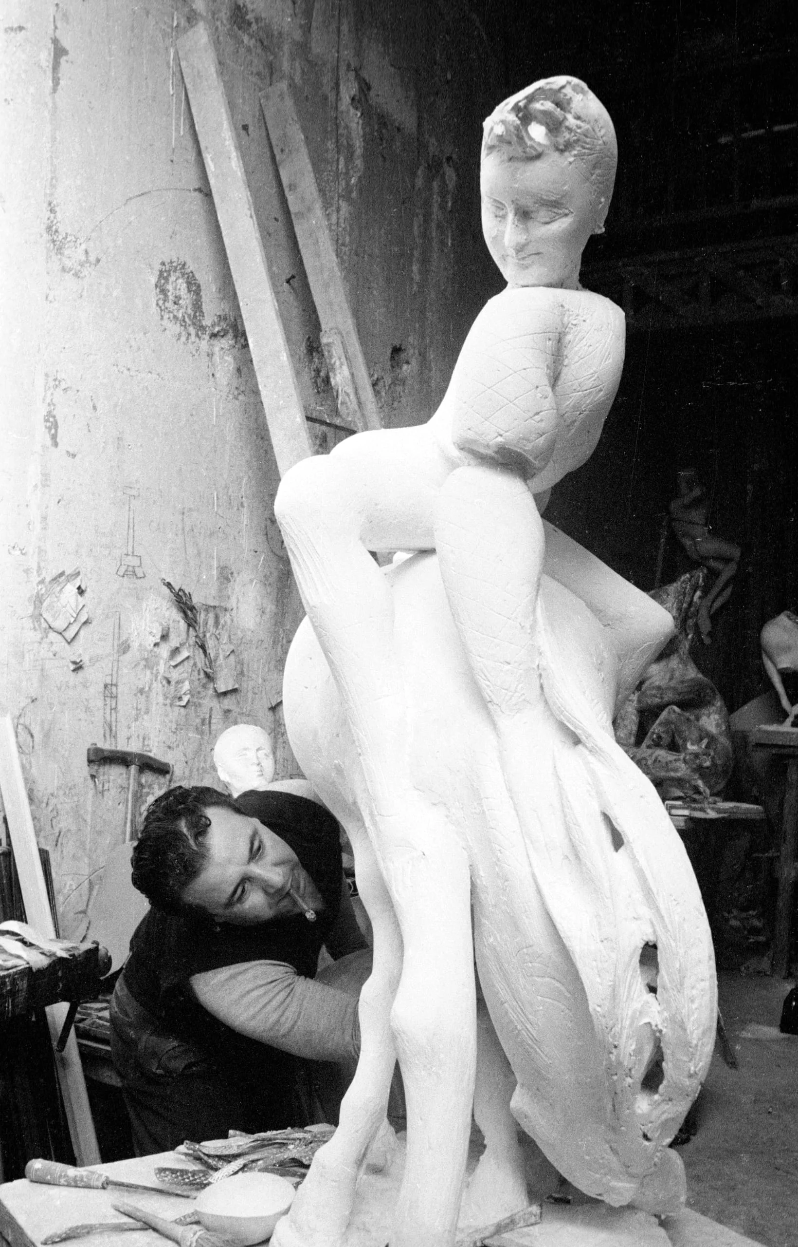 Black and white photograph of a dark-haired man leaning in to work on a large, in-progress plaster figure of a standing woman with a sweeping skirt-like base, in a cluttered studio