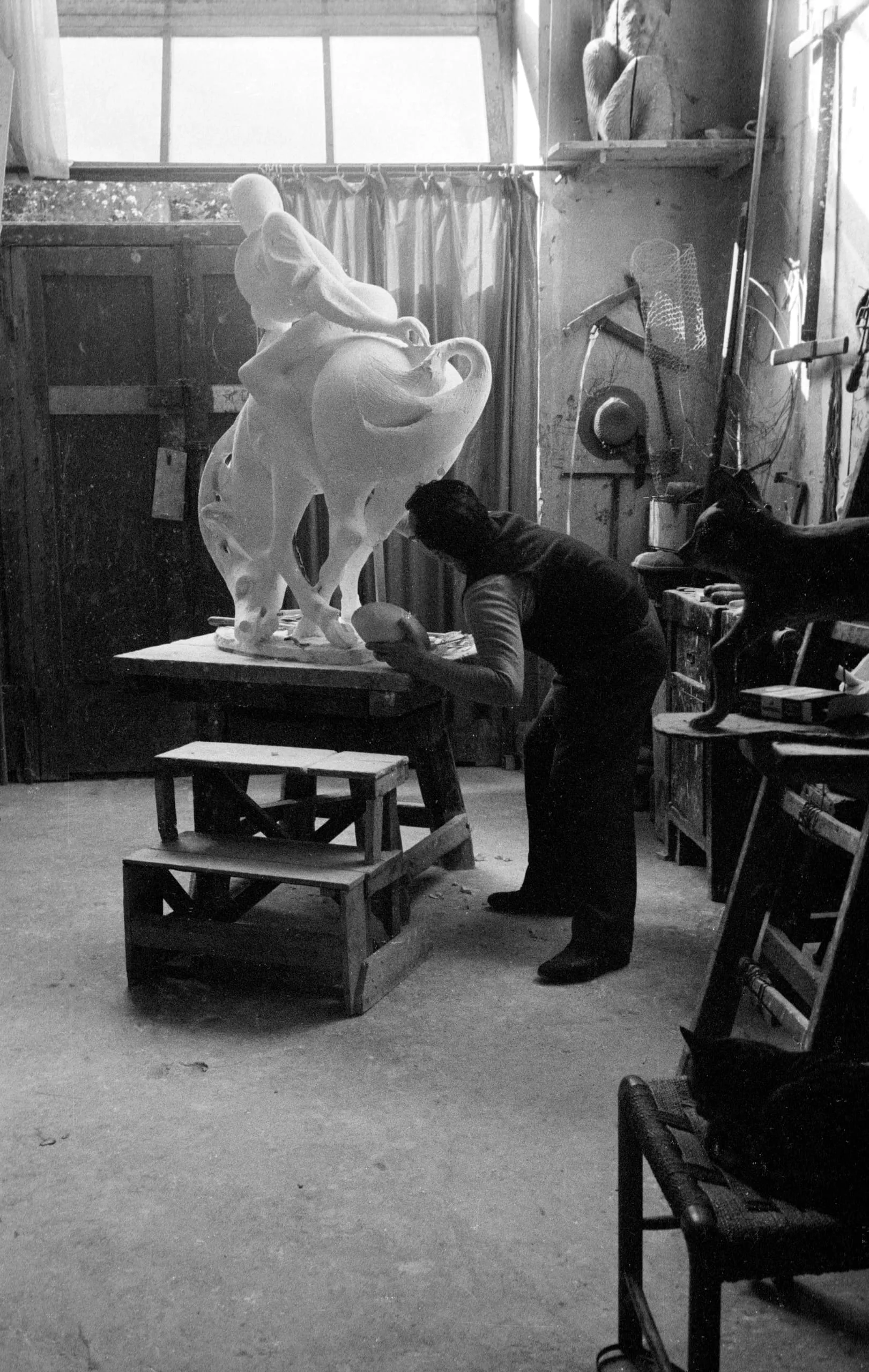 Black and white photograph of a person bending over the base of a large white abstract sculpture in a cluttered artist's studio