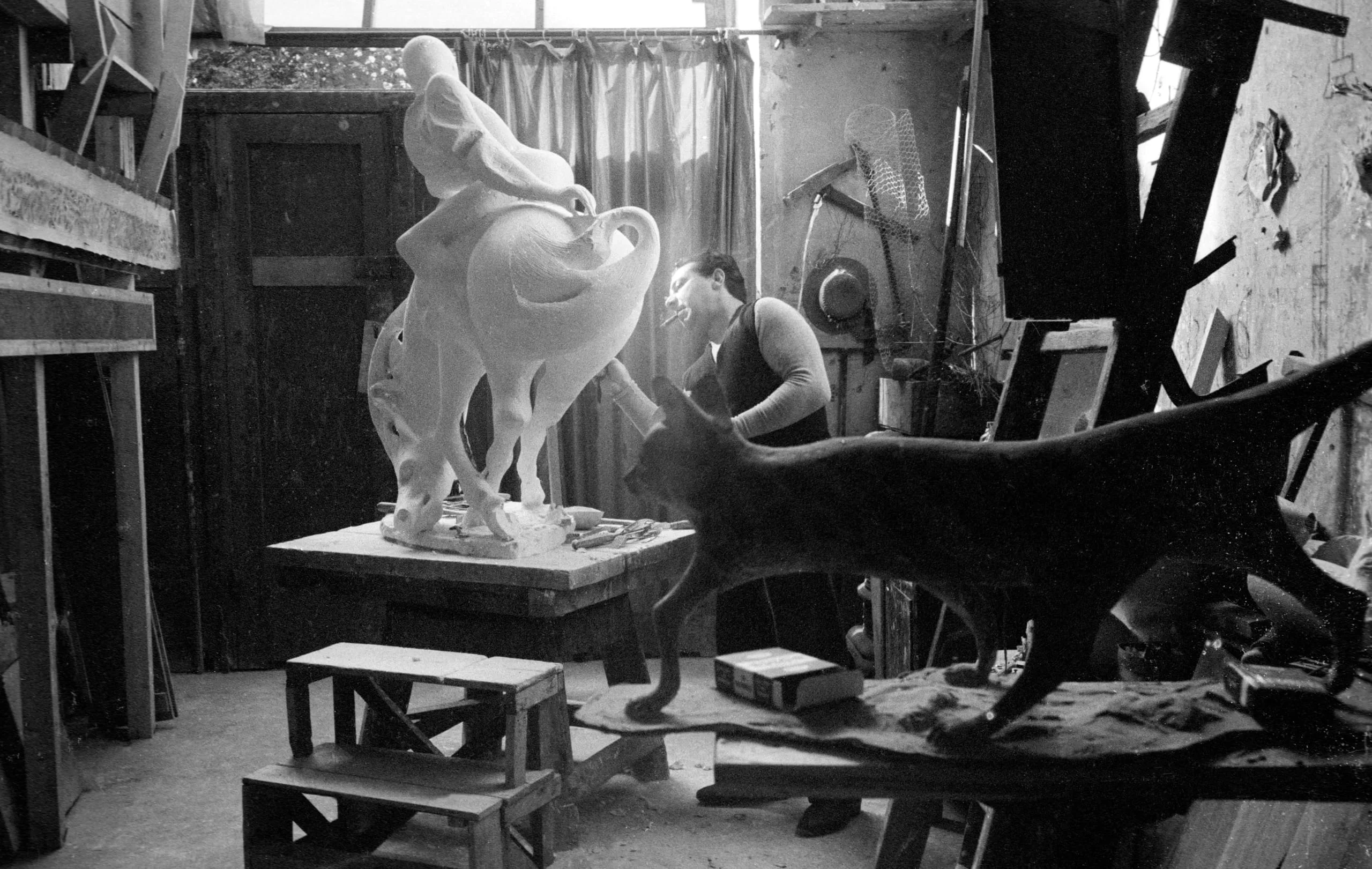Black and white photograph of a sculptor working on a large, rounded plaster figure in a cluttered studio, with a dark cat walking across the foreground