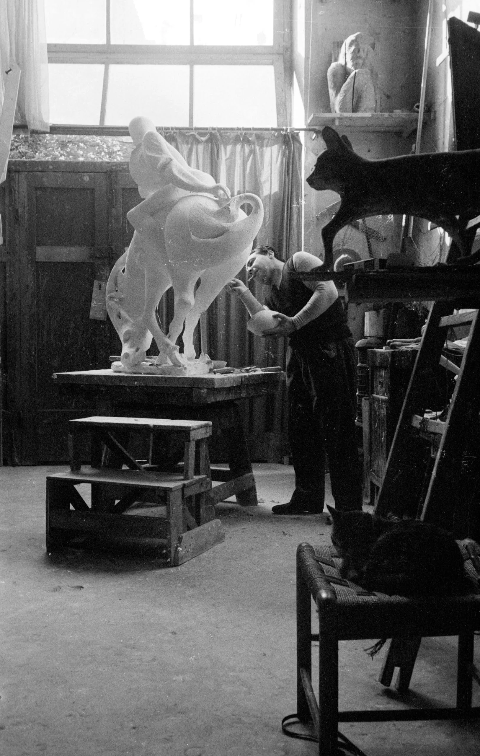 Black and white photograph of a sculptor working on a large, flowing white plaster abstract sculpture in a studio, with a cat resting on a chair in the foreground