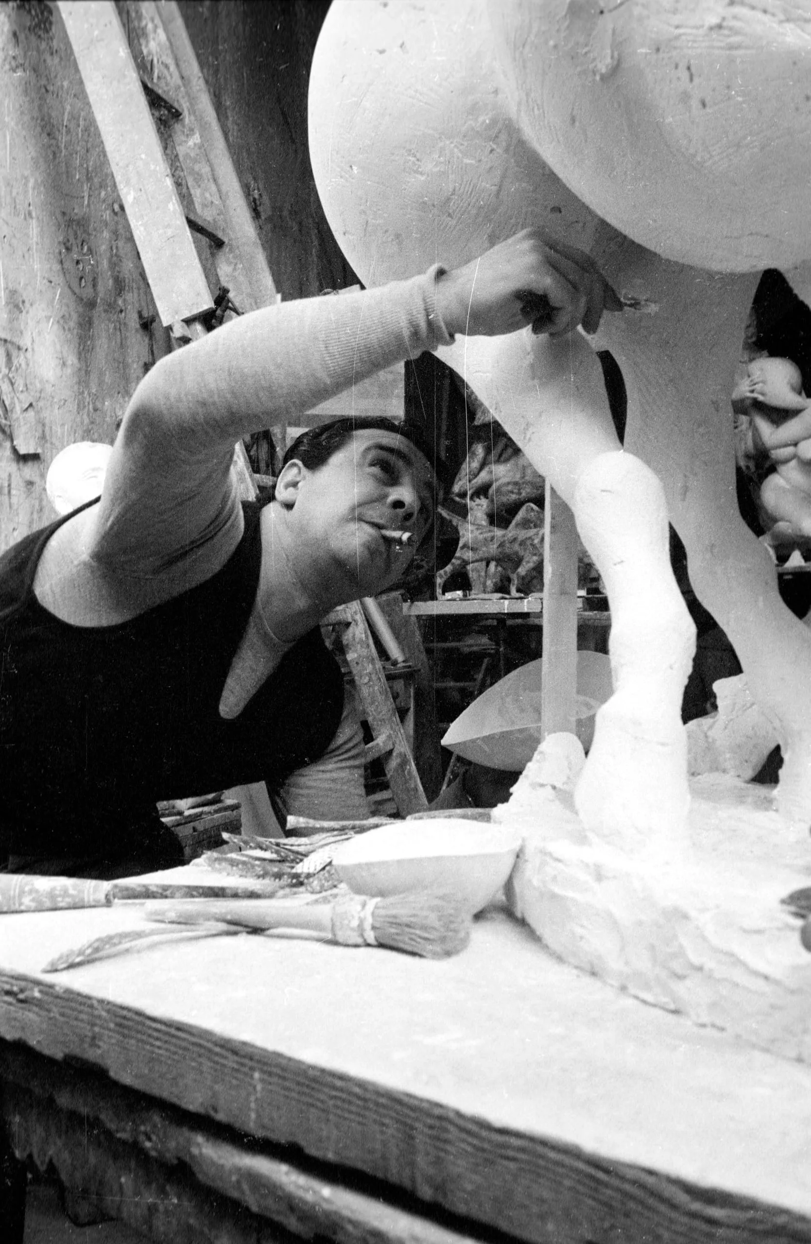 Black and white photograph of a man leaning in to work on a large white plaster sculpture in a studio, cigarette between his lips, brushes on the work surface below