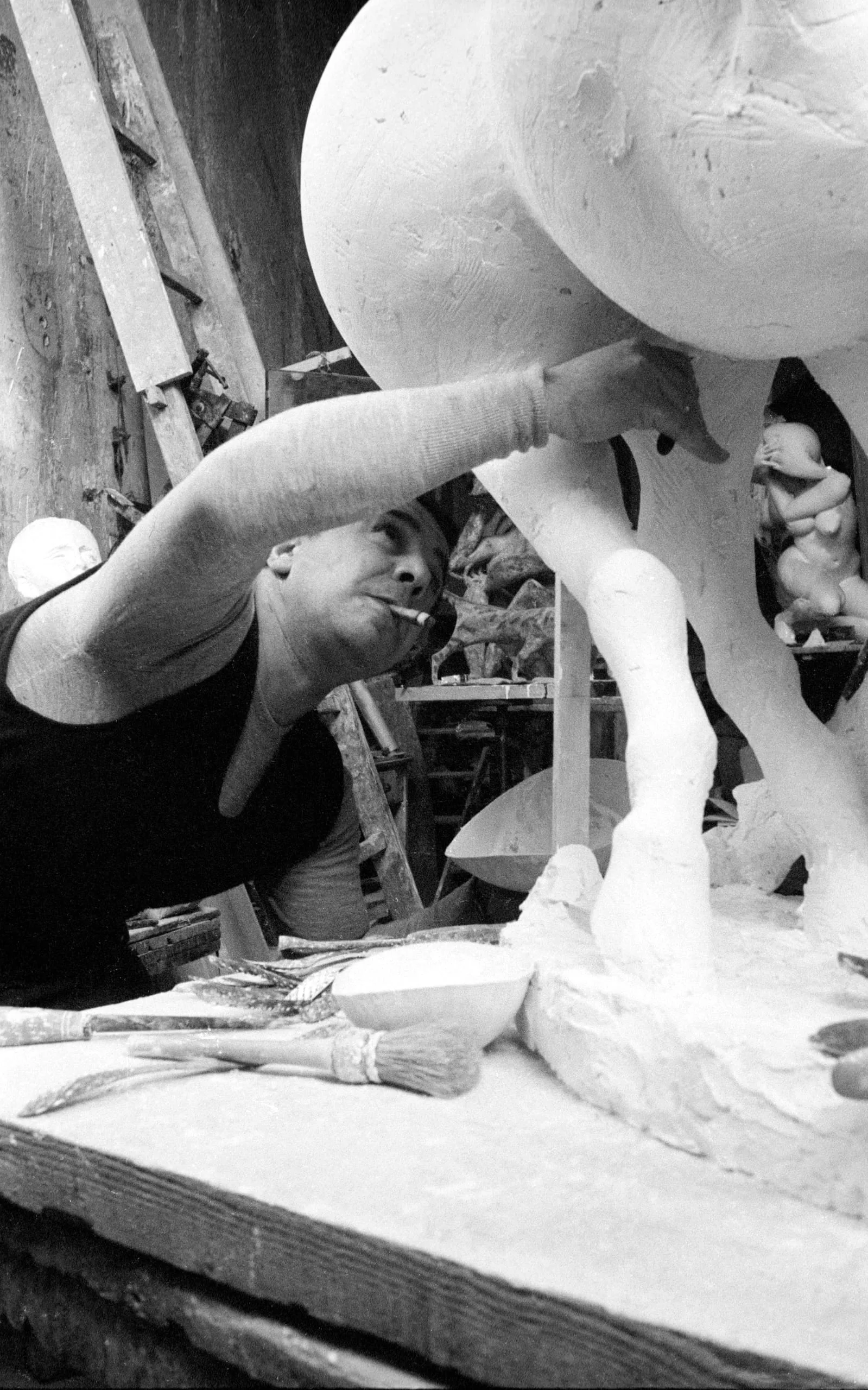Black and white photograph of a sculptor leaning into a large-scale plaster figure in a studio, cigarette in mouth, brushes and bowl in the foreground