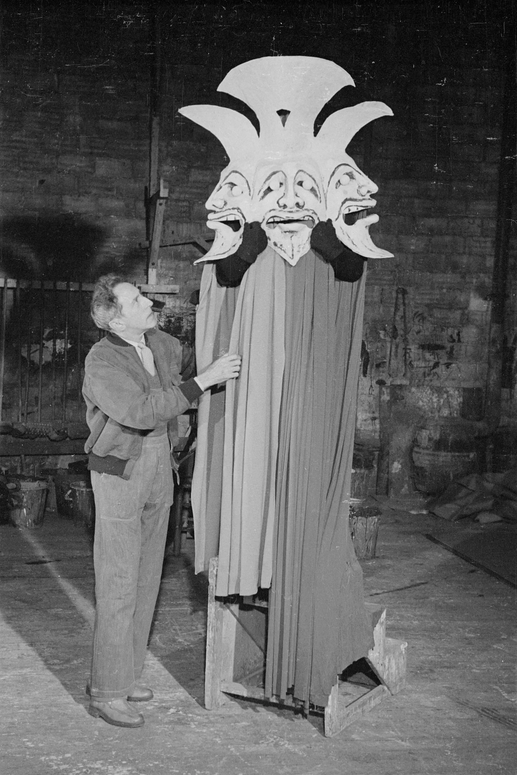 Black and white photograph of a man in work clothes standing beside a tall theatrical prop with three large grimacing masks and a crown-like top, in a dim workshop