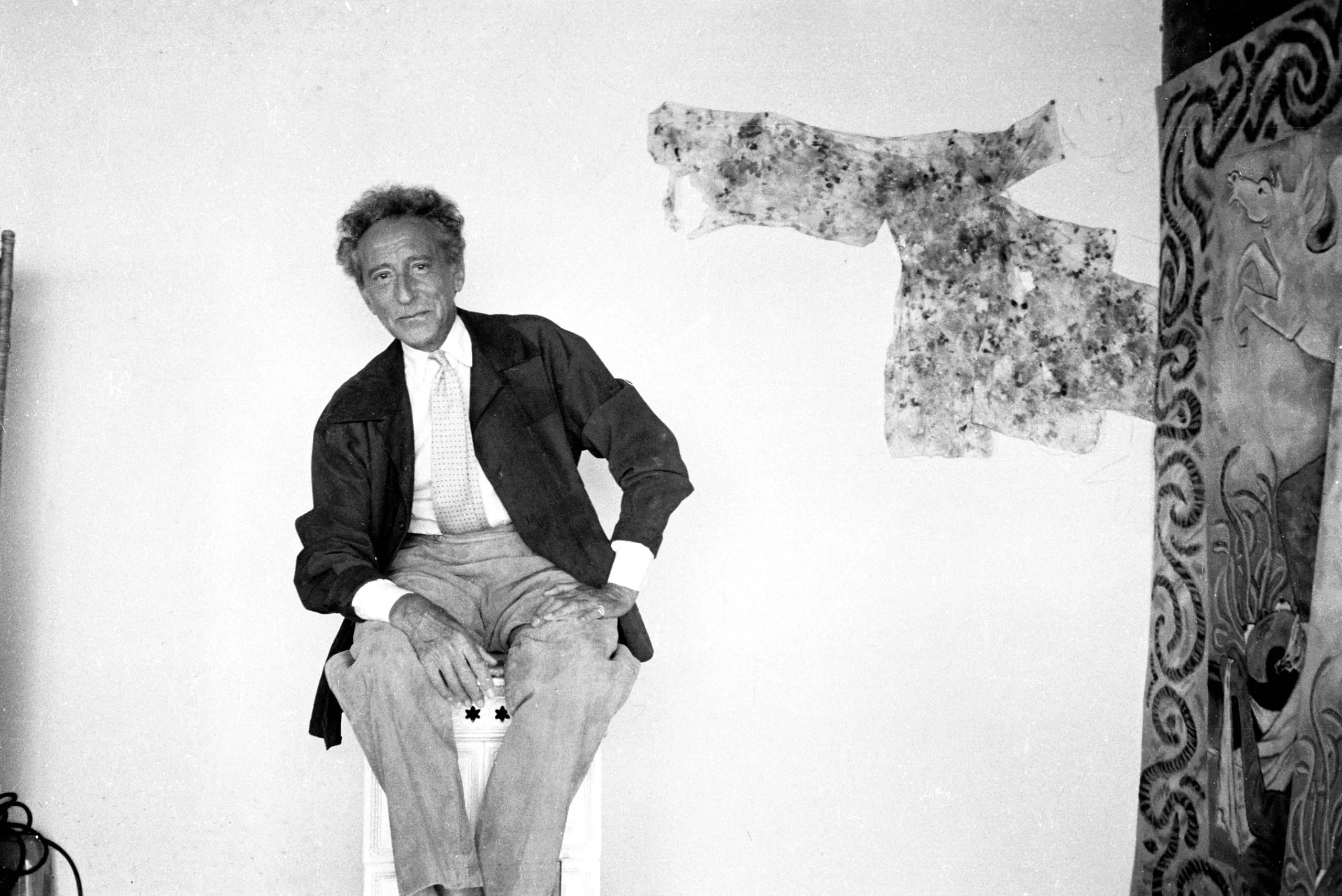 Black and white photograph of a man with curly hair seated on a stool, wearing a dark blazer and tie, with abstract wall art visible behind him