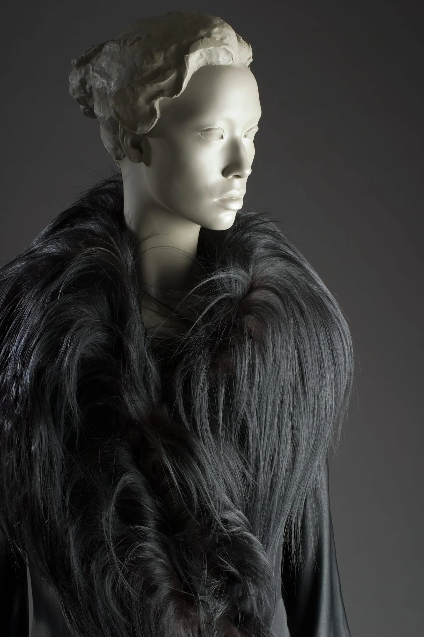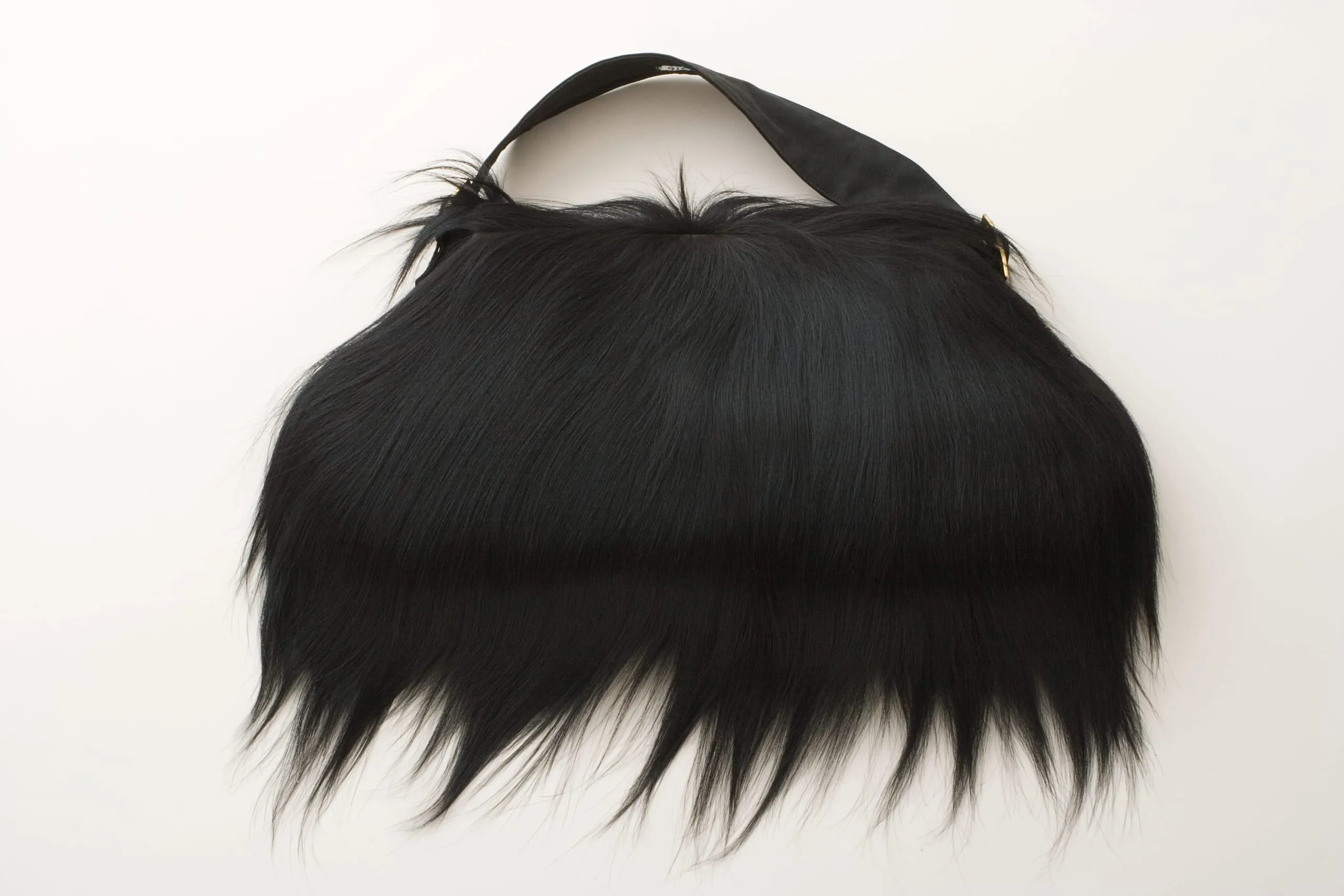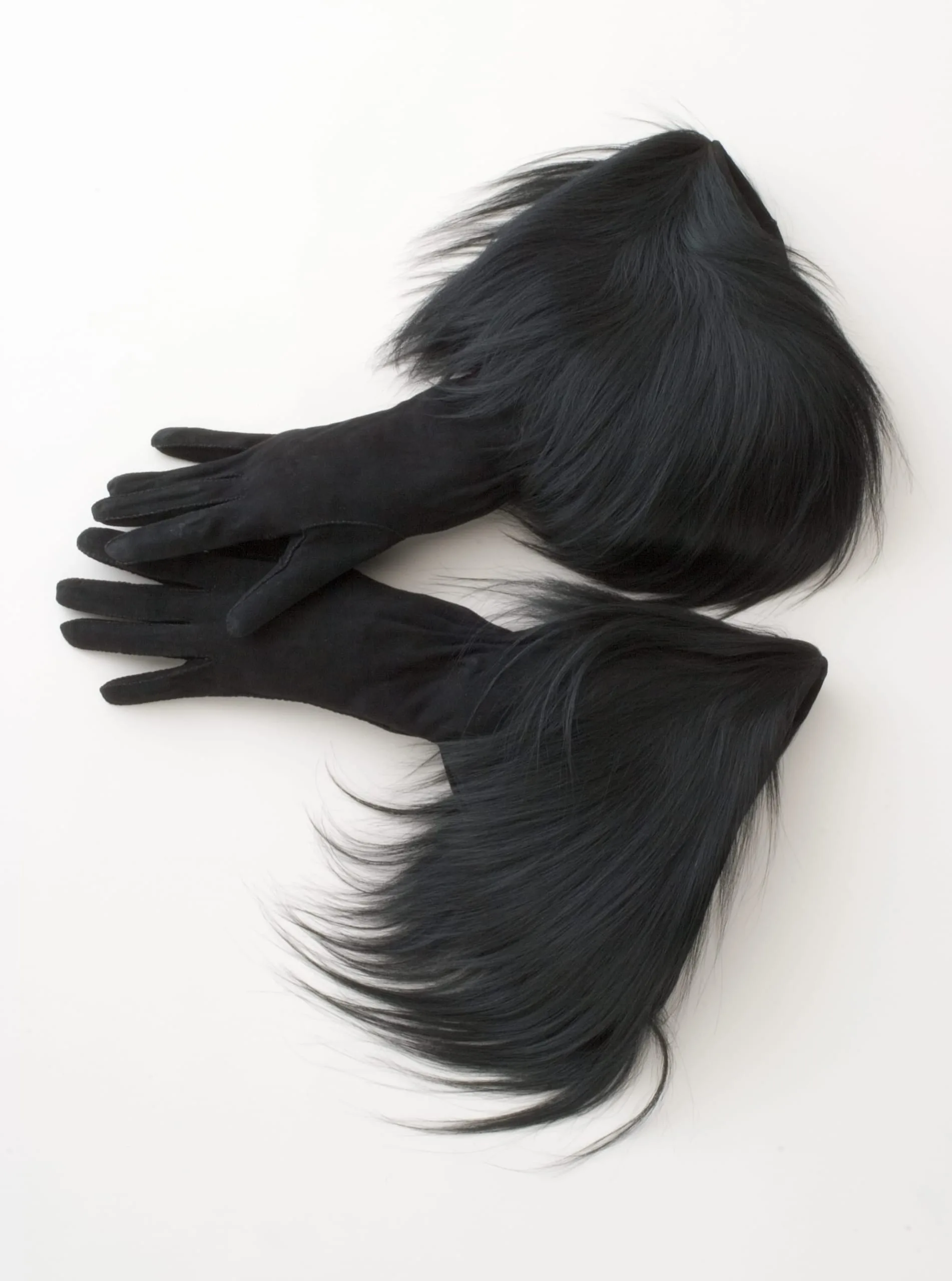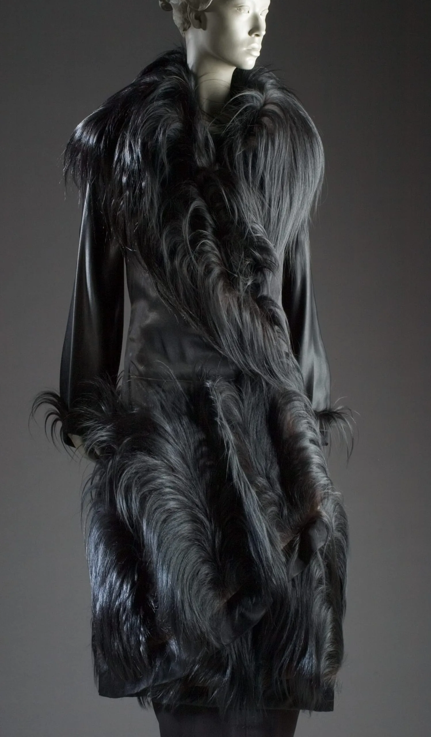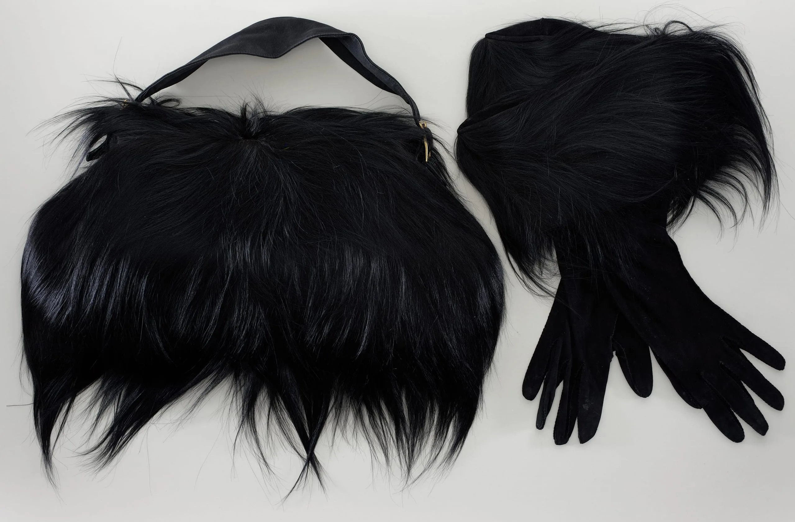 - Coat: rayon satin with monkey fur; Handbag: monkey fur with silk plain weave (faille) and metal; Gloves: leather and monkey fur
