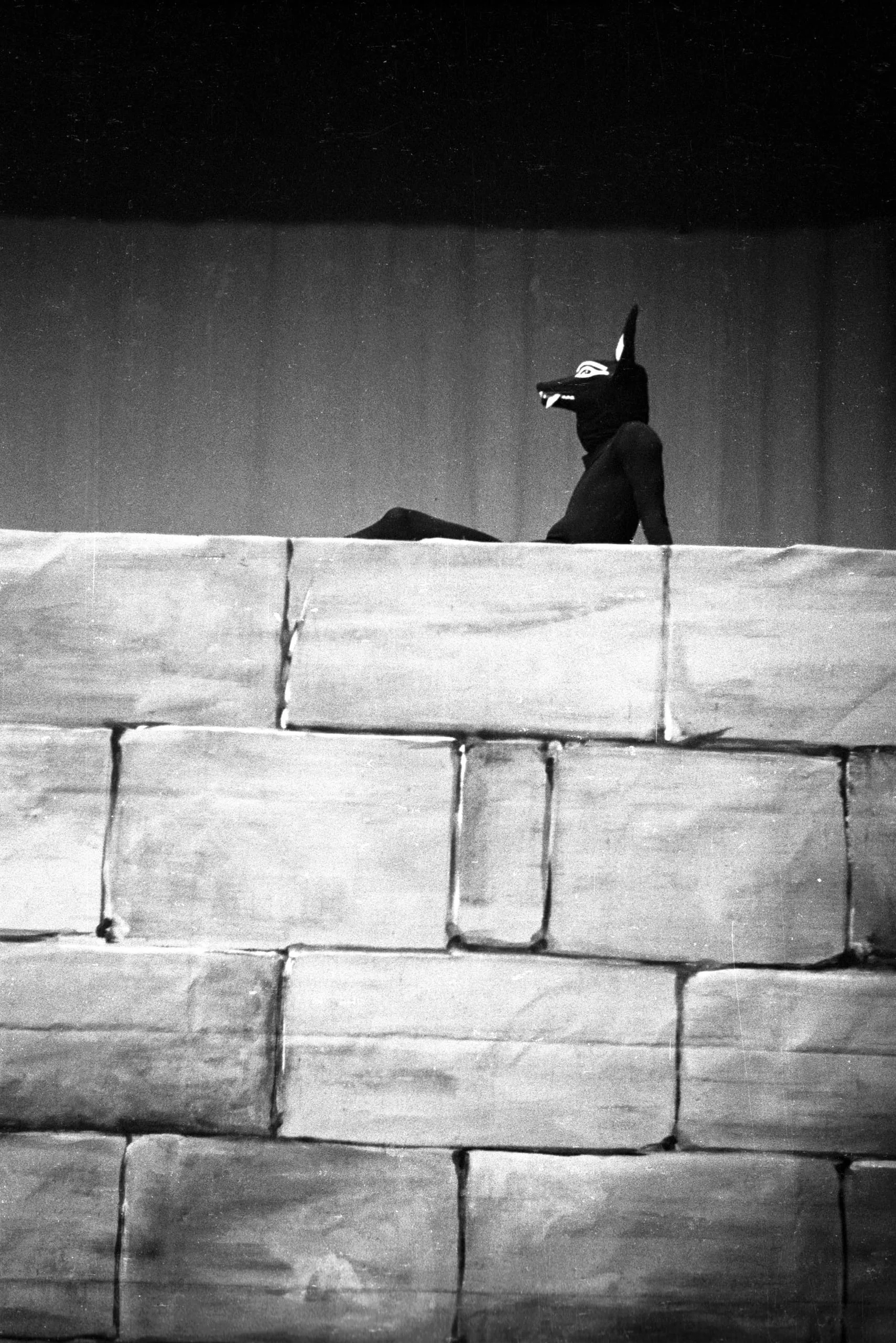 Black and white photograph of a figure in a full-body dark costume and jackal-head mask seated atop a painted stone-block stage set