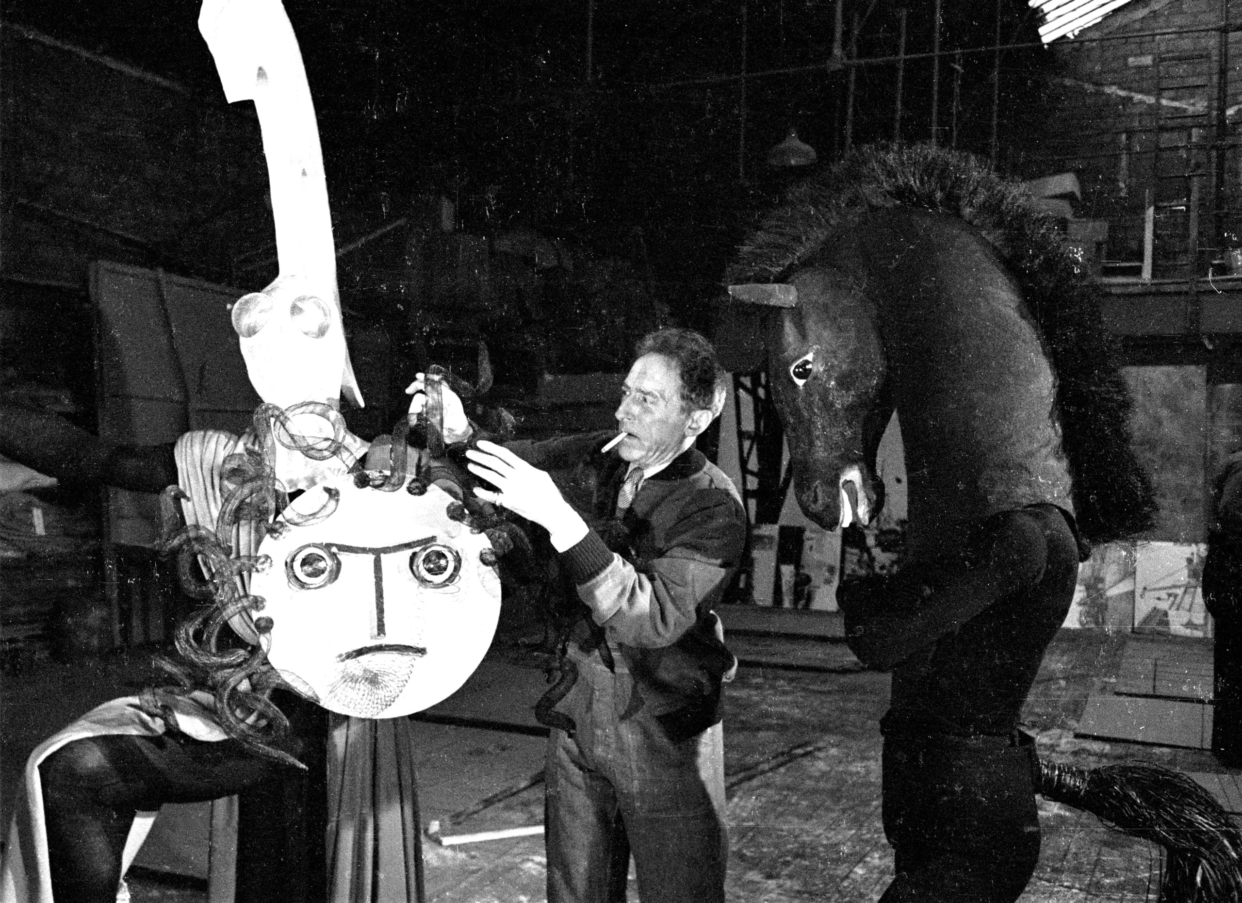 Black and white photograph of a man in a workshop adjusting a large painted face mask on a stand, with a life-sized dark horse prop looming behind him