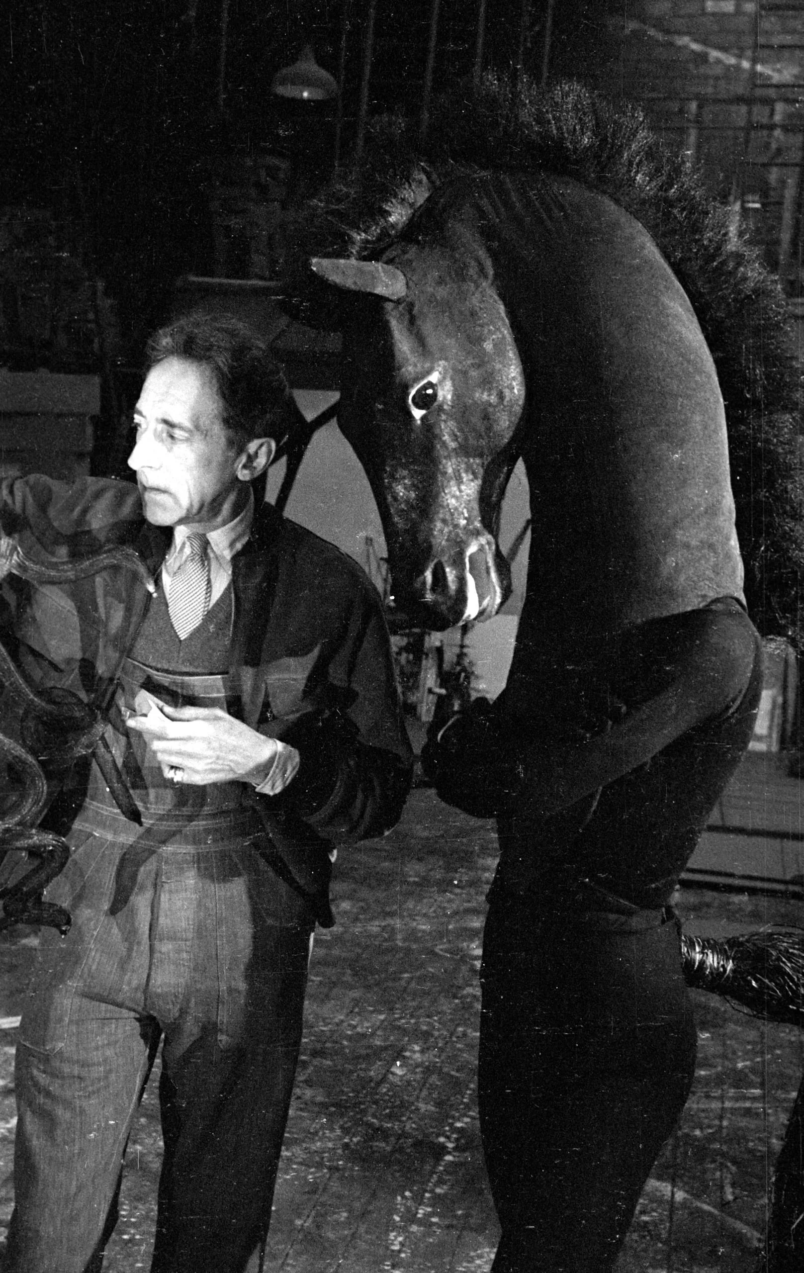 Black and white photograph, a lean white man in a vest and tie stands beside a large dark horse-head sculpture or prop in a dimly lit studio