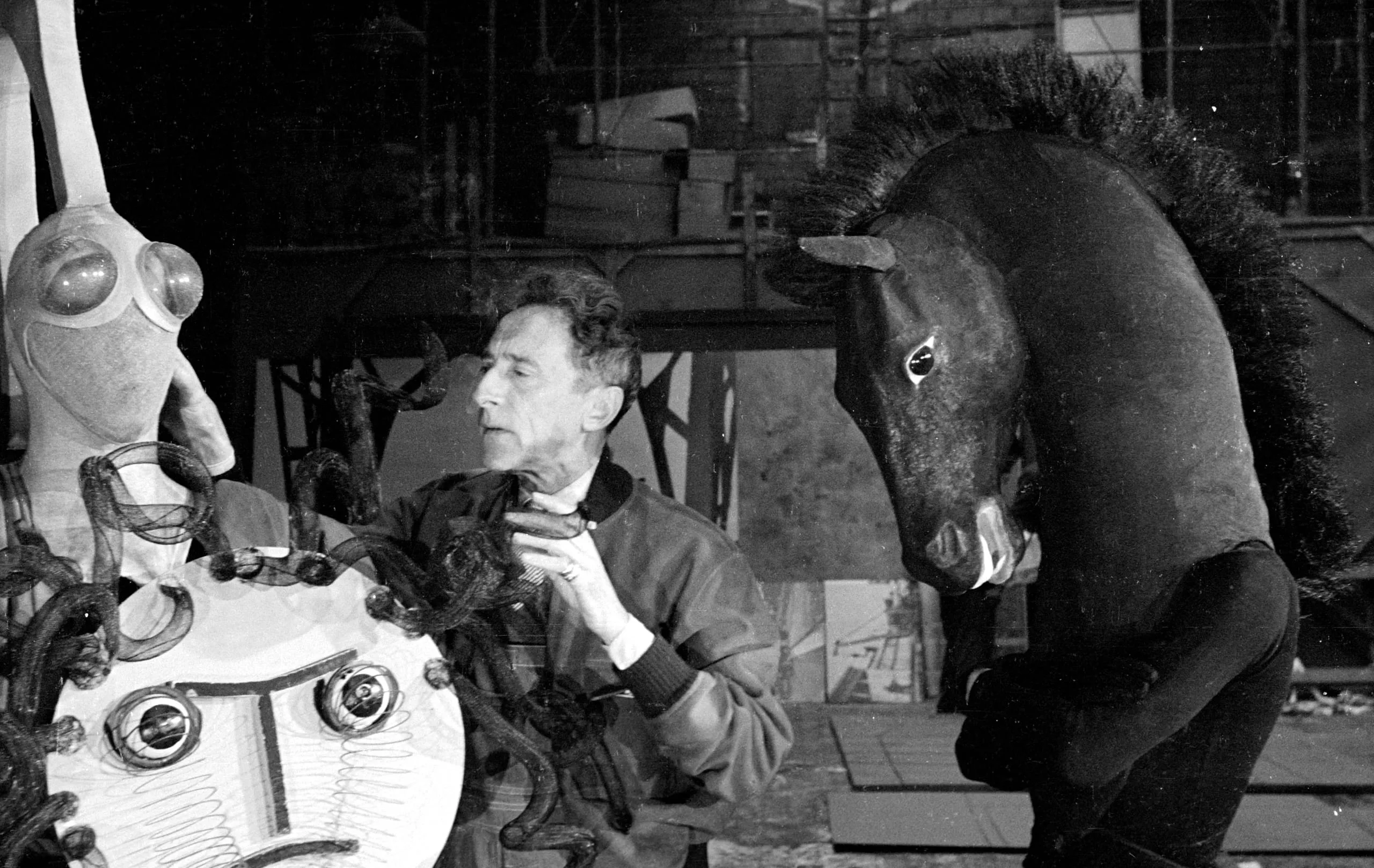 Black and white photograph of a man in a studio examining large sculptural objects, including an abstract face-like form and a dark horse-head prop or costume piece