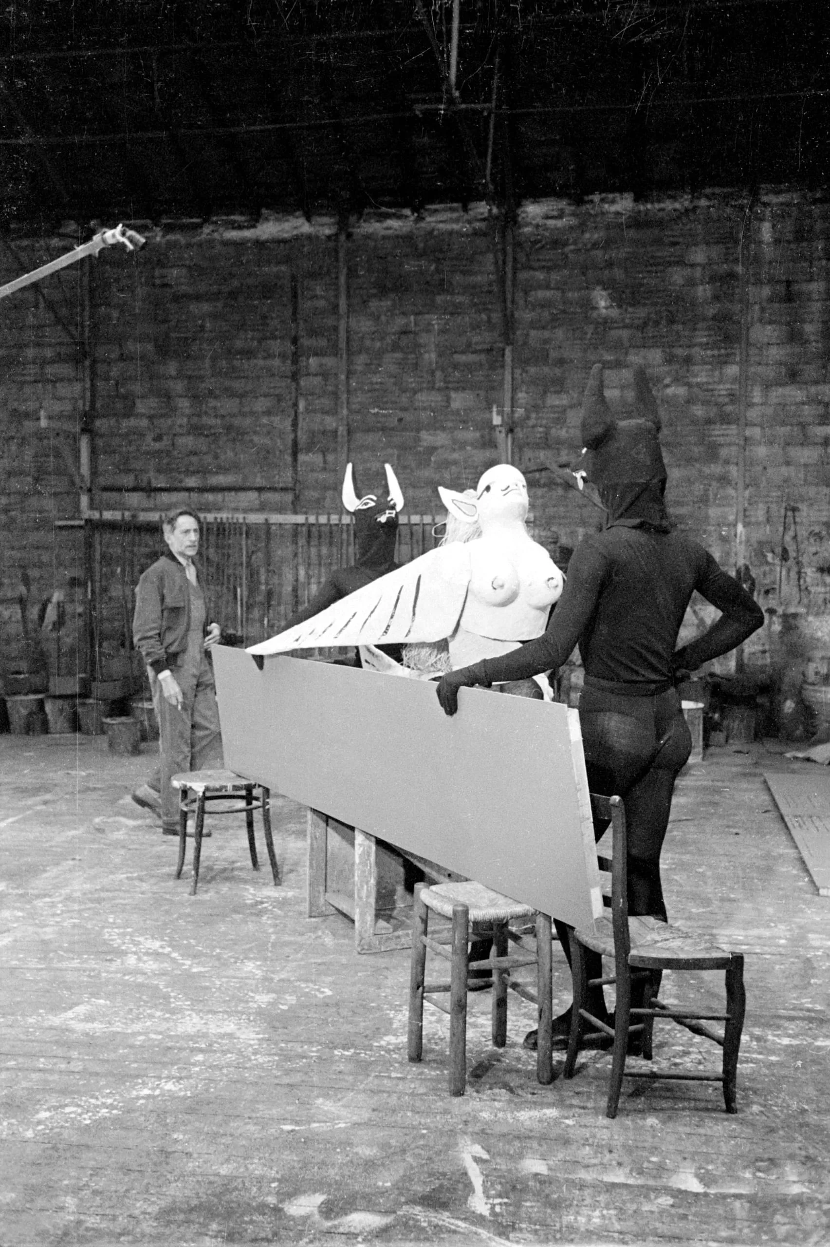 Black and white photograph of two figures and a large white sculptural form in a brick-walled studio, with a flat panel resting on wooden chairs