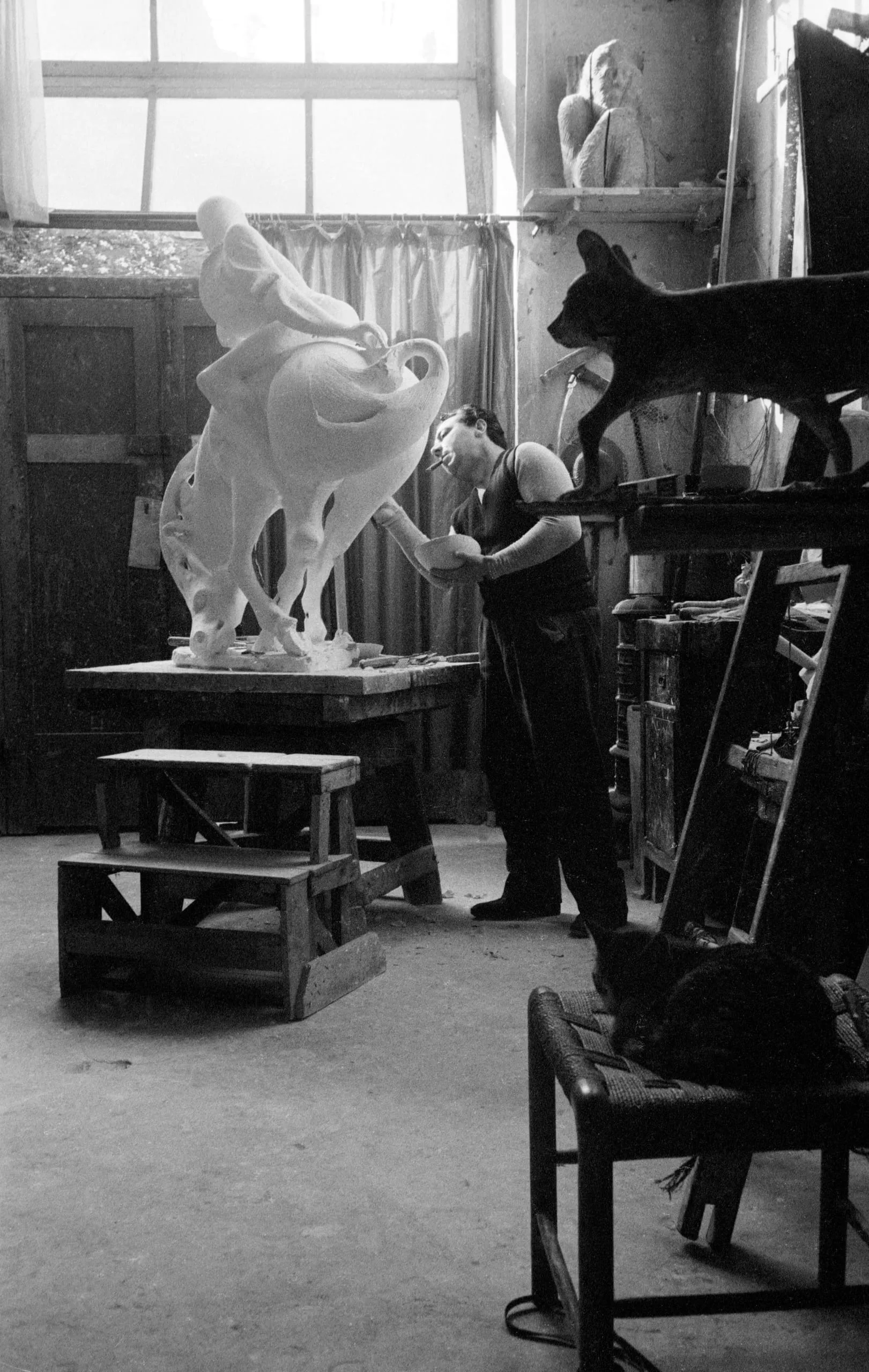 Black and white photograph of a man working on a large white plaster sculpture in an artist's studio, with a dark dog visible on shelving to the right