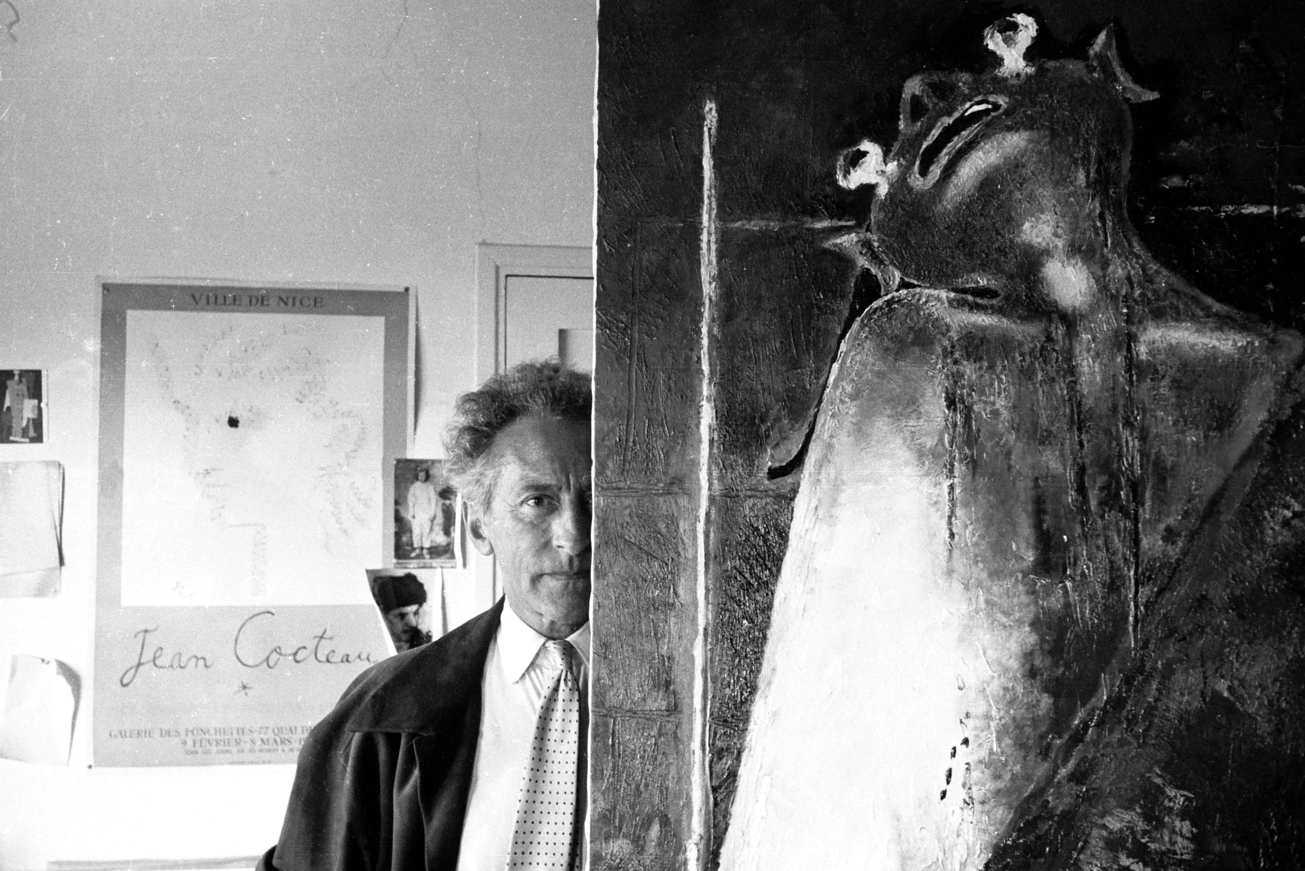 Black and white photograph of a man beside a Jean Cocteau exhibition poster, next to a large heavily textured impasto painting of a figure with head thrown back