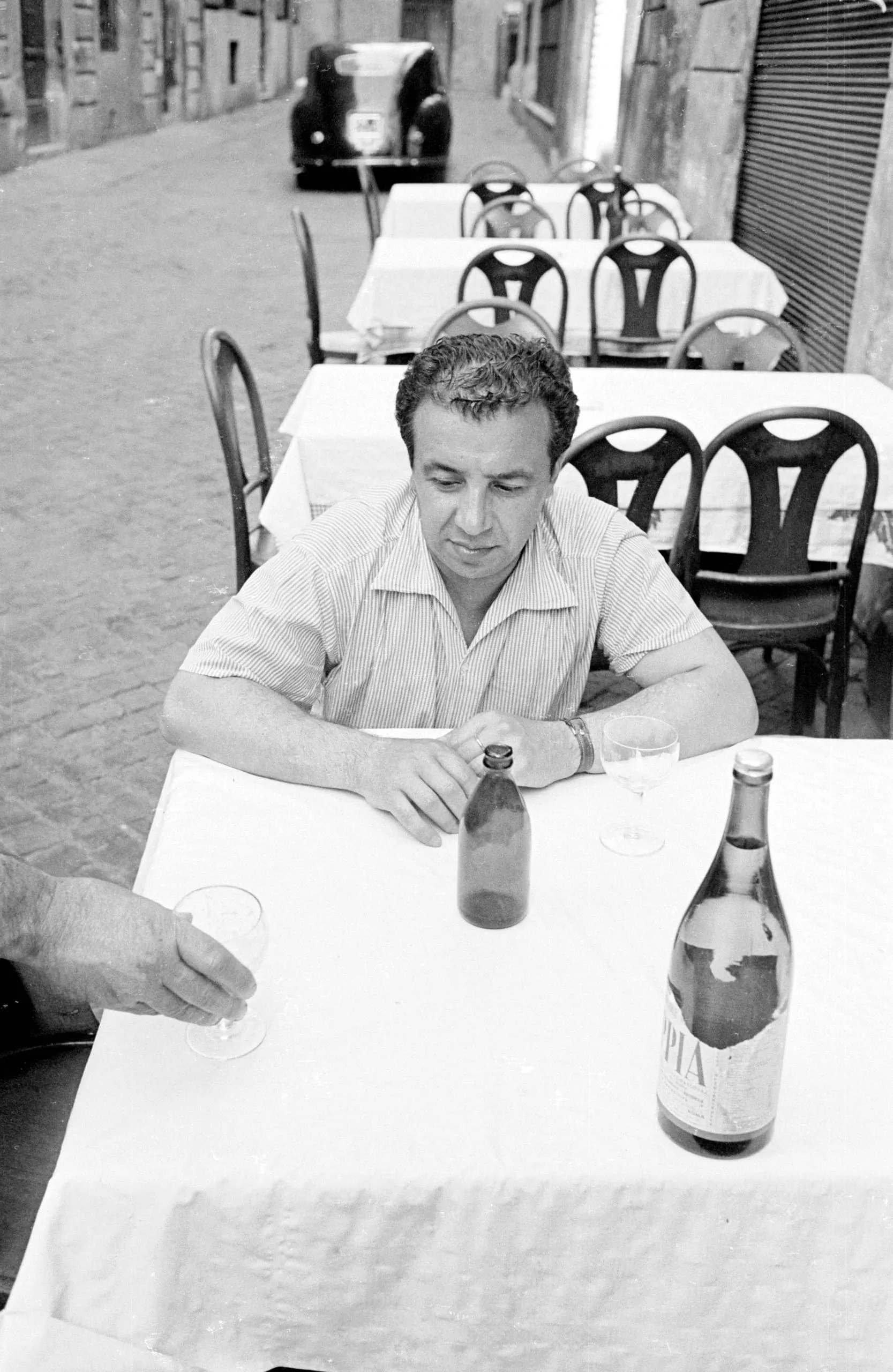 Black and white photograph of a man with dark curly hair seated at a white-clothed outdoor café table with two bottles and empty wine glasses, cobblestone alley behind him