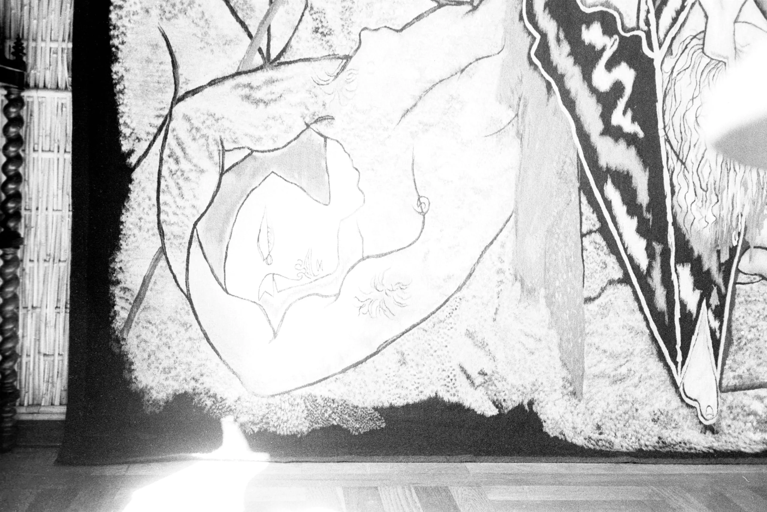 Black and white photograph of a large textile on a wall depicting a reclining nude figure in fluid outline against a pale textured ground, with bold black and white striped section at right